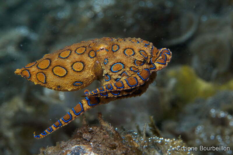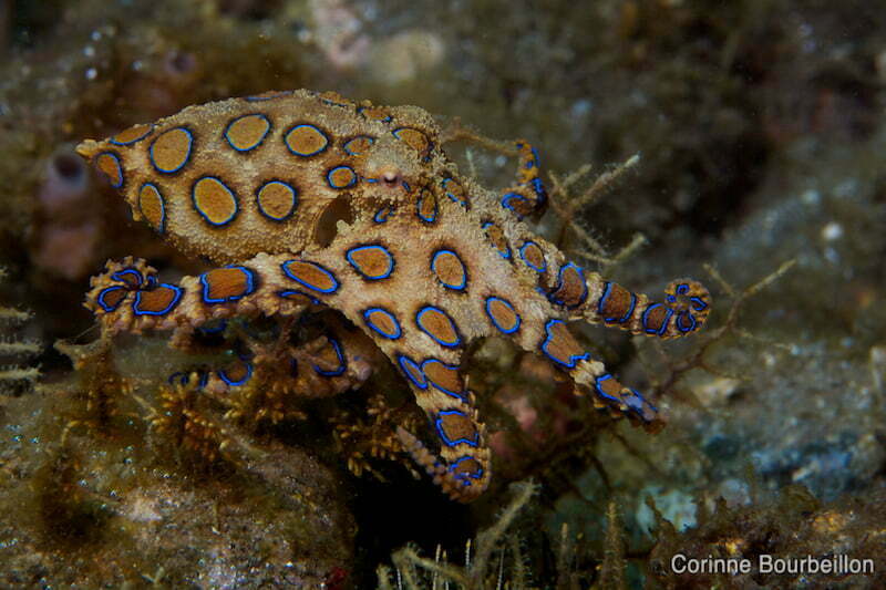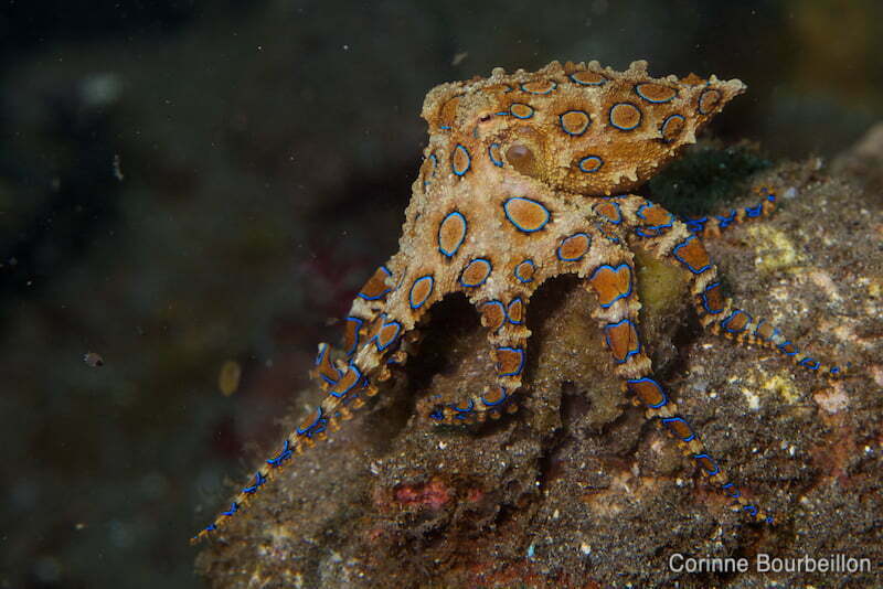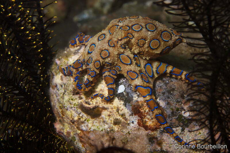 L’autre “truc”, qui a rendu ces plongées mémorables, c’est le très recherché, très rare et très dangereux poulpe à anneaux bleus ou blue ringed octopus.