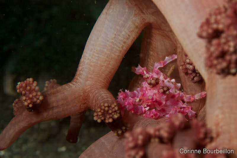 Puis je tente, tant bien que mal, de cadrer au plus près un minuscule crabe rose, planqué sur une branche de corail mou. Re-flash.