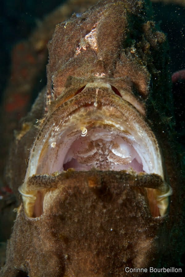 Poisson-crapaud. Alor, Indonésie. Juillet 2012.Coup de bol. Ce gros poisson-crapaud que je photographie sous toutes les coutures daigne soudain ouvrir la gueule au moment où je déclenche, pas du tout impressionné par ma dévotion photographique.