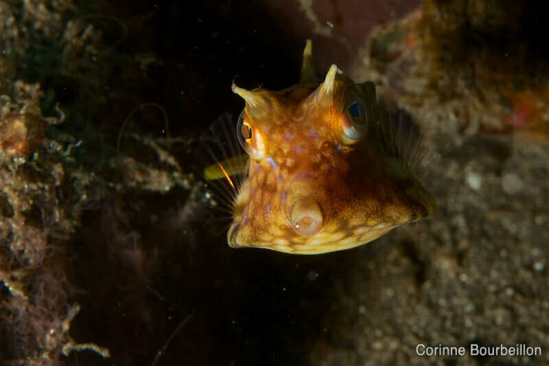 Un poisson-coffre à cornes me fixe avec ses gros yeux tout ronds, comme interloqué. Je flashe.
