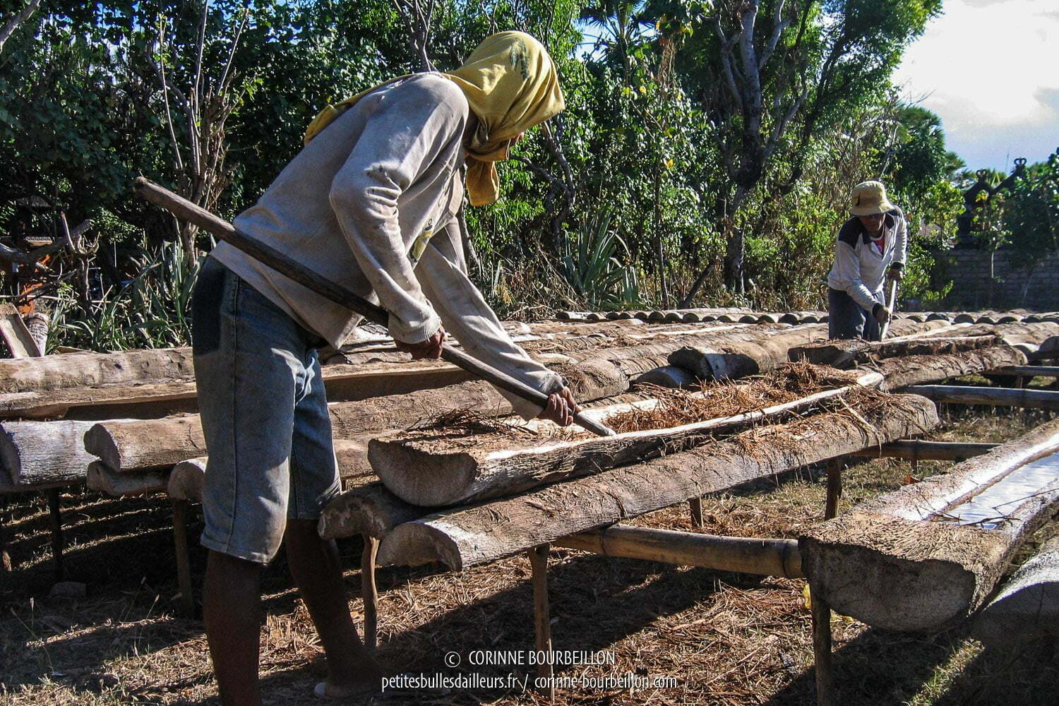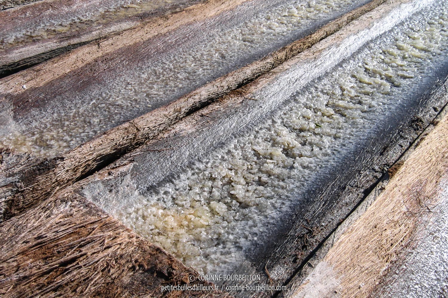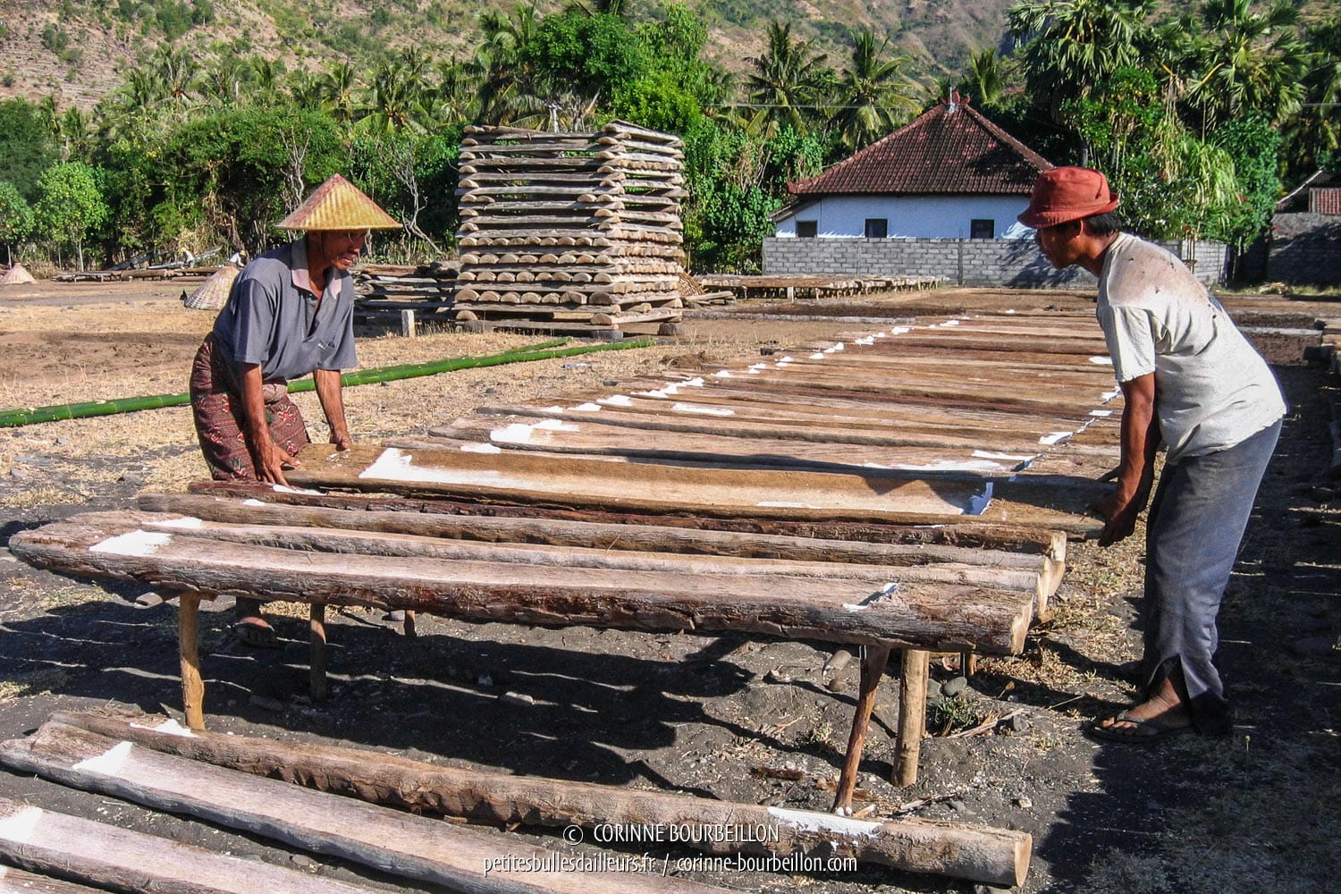 L’eau saumâtre est recueillie dans des troncs de cocotiers évidés et mise à nouveau à évaporer. Au fond des troncs, on voit se former les cristaux de sel.