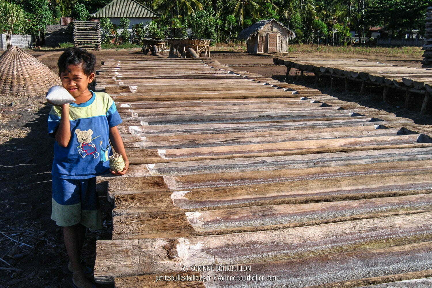 Le sel se dit garam en indonésien. Quand j’arrive sur la plage, les gamins du coin me repèrent et m’entourent. Ils veulent tous me vendre de petits paniers-souvenirs, contenant une poignée de garam.