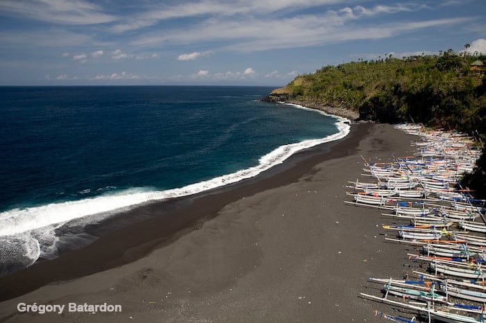 C’est la plage parfaite. Une magnifique anse de vrai sable noir, découverte en juillet 2008, à Bali. Je n’avais même pas pu vous la montrer. Ce jour-là, mon appareil-photo était tombé en rade de batteries. La voici.