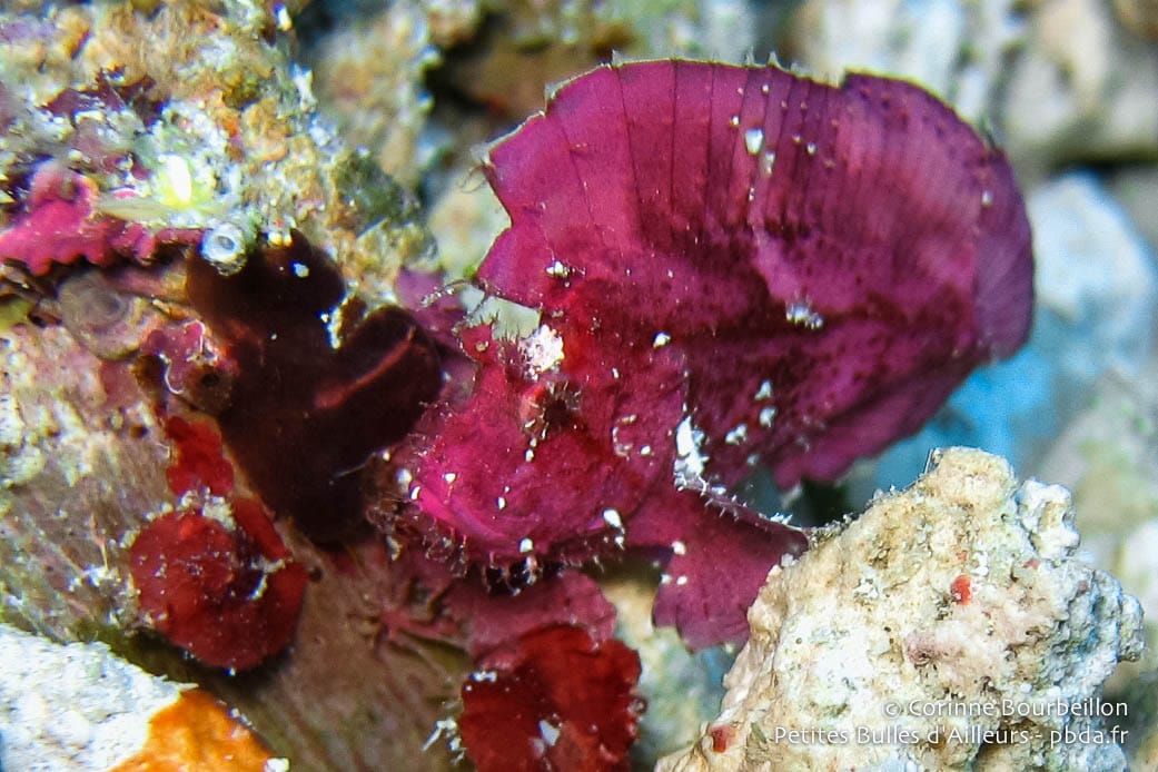 Poissons-anges et papillons, rascasses, nudibranches, et les très recherchés poissons-feuilles sont nombreux… J’ai croisé peu de “gros”, sinon quelques tortues et napoléons, ainsi qu’une jolie raie aigle… Un triangle noir gracieux aperçu au loin dans le bleu – trop loin, hélas – qui semble “voler” sous l’eau.
