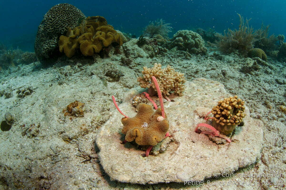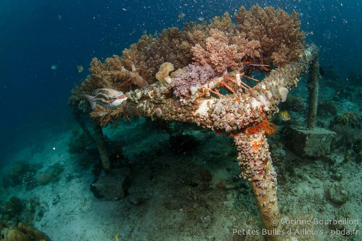 Ça m’a rappelé le projet Biorock de Pemuteran, à Bali, où, sur le même principe, les “Jardiniers du récif” s’emploient à récupérer et fixer des bouts de corail sur des structures artificielles – métalliques, dans le cas de Biorock, pour stimuler la fixation et la croissance du corail par courant électrique.