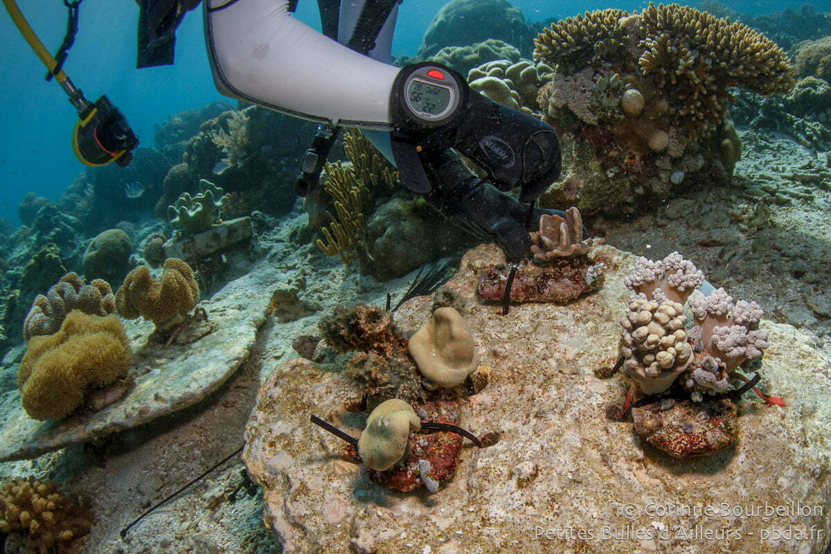 J’y ai accompagné un après-midi Clara en plongée, dans 3 mètres d’eau, pour la voir accomplir ce patient travail qui consiste à fixer sur des supports stables, des morceaux de corail cassés, pour favoriser leur “repousse”. Le corail n’est pas un végétal, on ne peut donc pas vraiment parler de “bouture”, mais c’est l’idée.