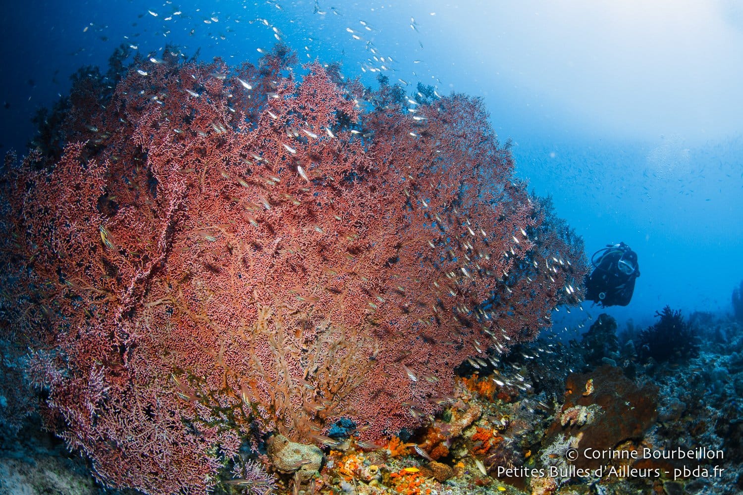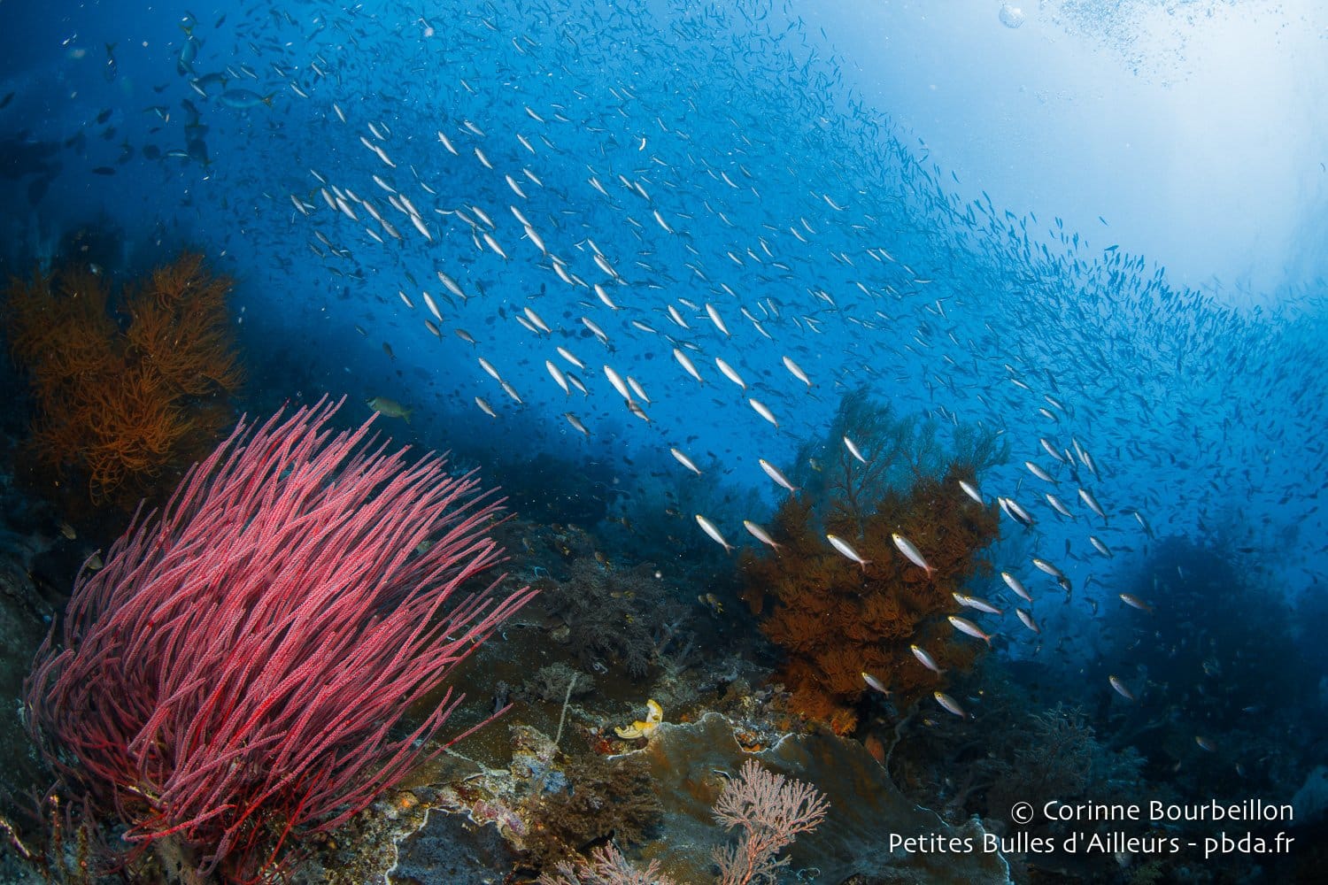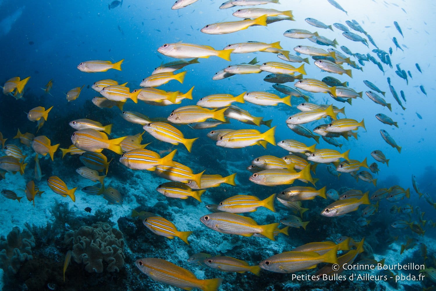 Il y aura les requins-marteaux massifs et les tourbillons de carangues argentées. Les nuées de balistes bleus et de fusiliers à dos jaune, les cascades scintillantes des poissons de verre, les virevoltes multicolores des poissons-papillons… Et puis aussi les gracieuses tortues vertes, les énormes poissons-perroquets à bosse, les majestueux napoléons. Les bancs jaune vif des vivaneaux et les entrelacs délicats des gorgones géantes…