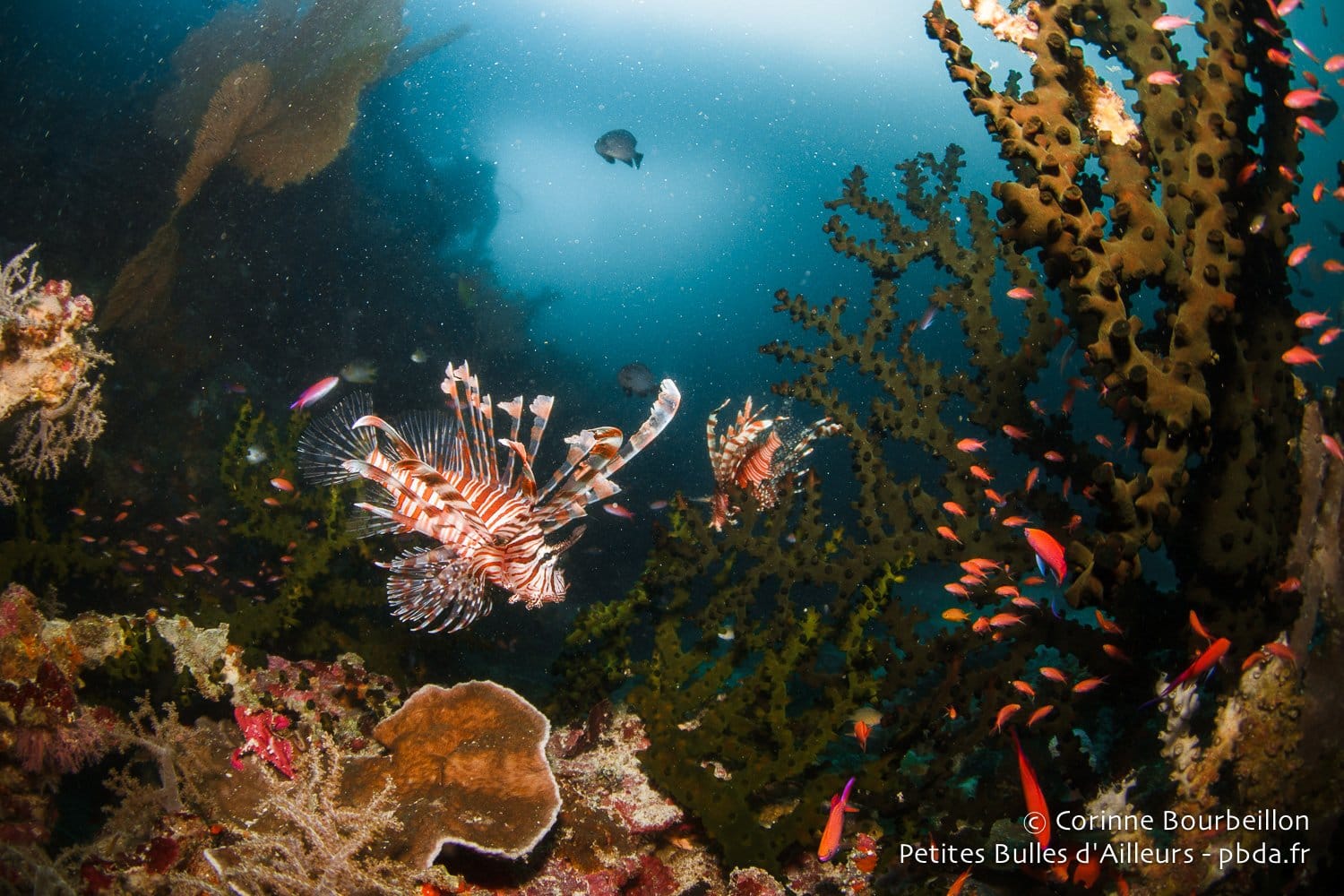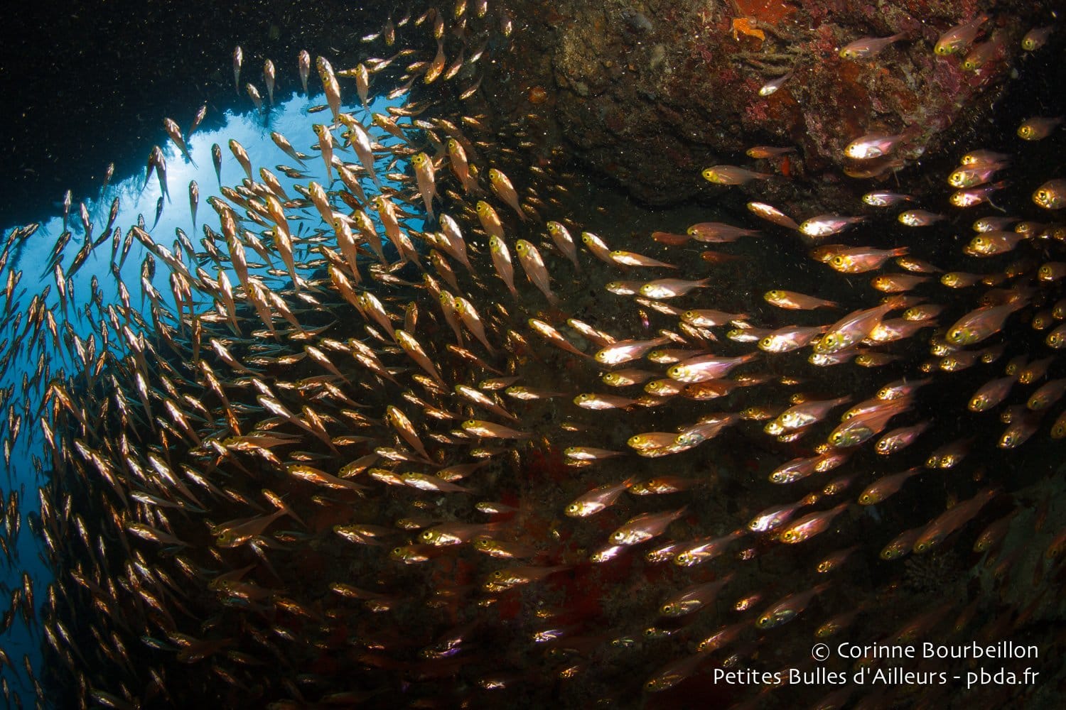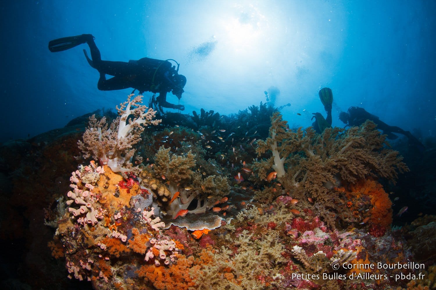 Il y aura les requins-marteaux massifs et les tourbillons de carangues argentées. Les nuées de balistes bleus et de fusiliers à dos jaune, les cascades scintillantes des poissons de verre, les virevoltes multicolores des poissons-papillons… Et puis aussi les gracieuses tortues vertes, les énormes poissons-perroquets à bosse, les majestueux napoléons. Les bancs jaune vif des vivaneaux et les entrelacs délicats des gorgones géantes…