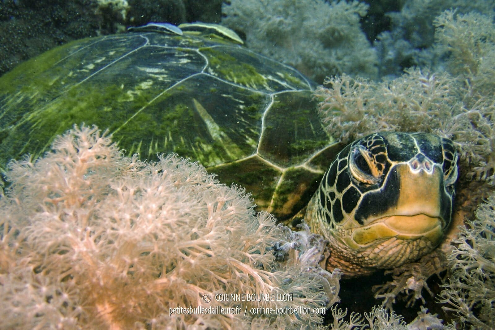 Ils sont beaux ces nudibranches ! Et même si la tortue est un peu verte j’aime beaucoup ce cadrage, au milieu des coraux mous.