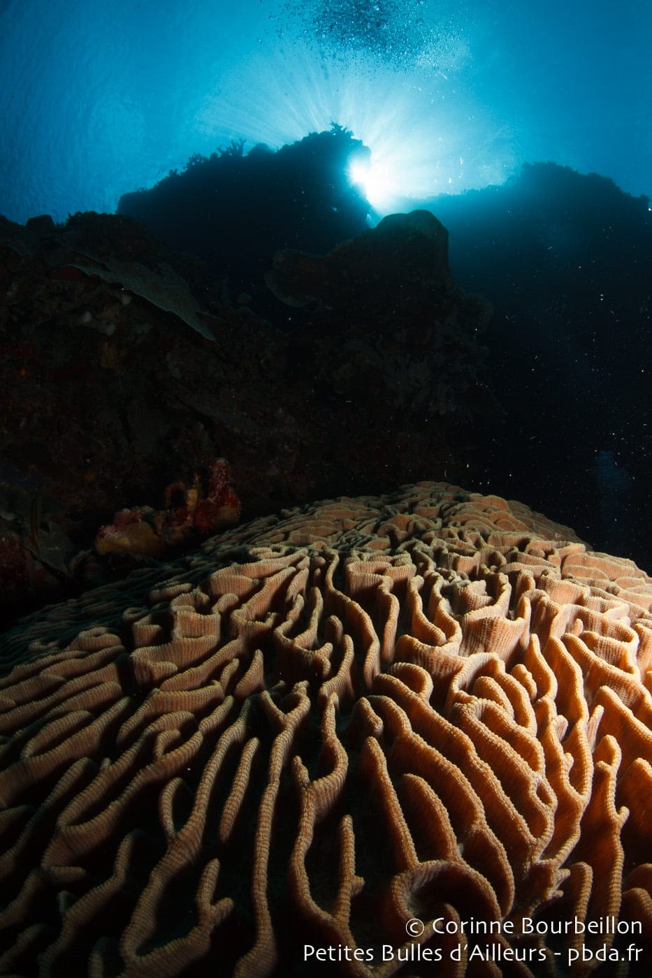 À la mi-journée, le soleil tombe sur le sommet du récif, offrant un jeu de lumière spectaculaire le long du tombant.