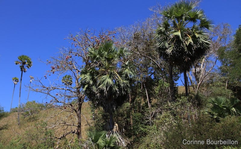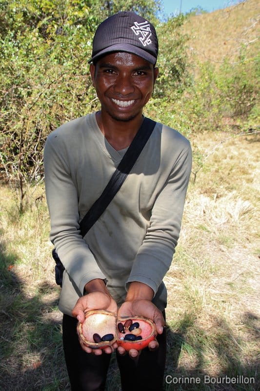 Jérôme, mon guide plongée sur le Pascha, est de la partie. Et notre guide-ranger, adorable, s’arrête régulièrement pour nous montrer les curiosités naturelles de l’île : des fruits comestibles emprisonnés dans une calebasse, dont j’ai oublié le nom. Des poules d’eau planquées dans la mangrove. Les trous creusés par les varans femelles, où elles déposent leurs œufs. Un singe suspendu haut dans un entrelacs de branches.