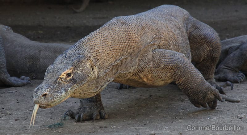 Dragon de Komodo. Rinca, Indonésie, juillet 2011.Les varans de Komodo mesurent 2,50 à 3 mètres de long, queue comprise. On a longtemps cru que leur salive contenait des bactéries très toxiques. En fait, comme d’autres reptiles, ils ont des glandes à venin [voir la section “Venin et bactéries” sur la fiche Wikipédia]. Une morsure peut être fatale.