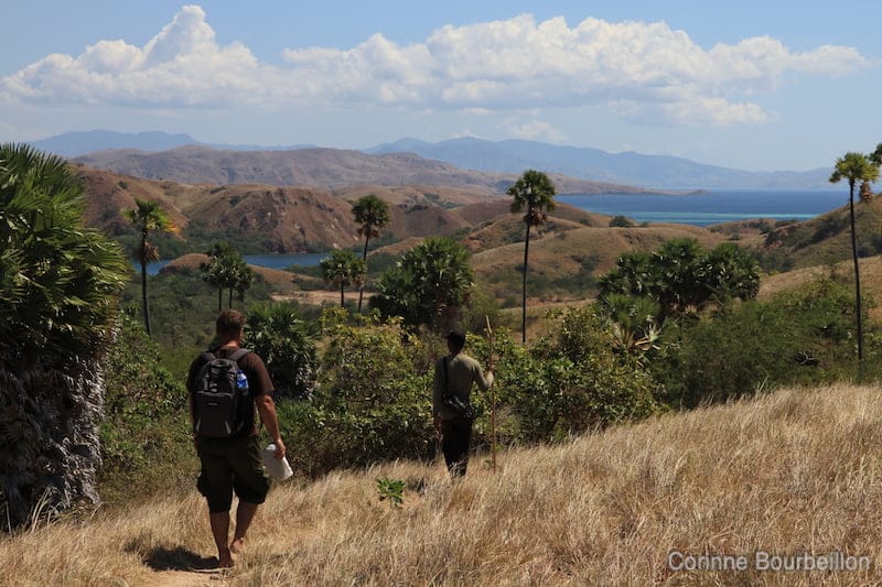 L’île de Rinca est aride. Un paysage de savane, avec très peu d’ombre, surplombant l’azur de l’eau. Quelques palmiers çà et là.