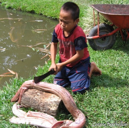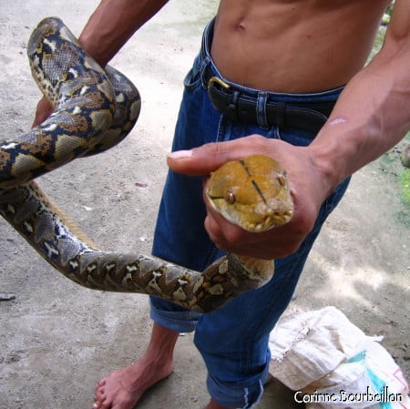Au programme: dépiautage sous nos yeux pas très enthousiastes de gros serpents, apportés par des paysans. Le gars de la ferme en conserve précieusement la peau pour la revendre. Ensuite, hachage de la chair des serpents en morceaux. Et c’est un môme haut comme trois pommes qui manie la machette, pas peu fier de nous montrer comment il s’y prend!