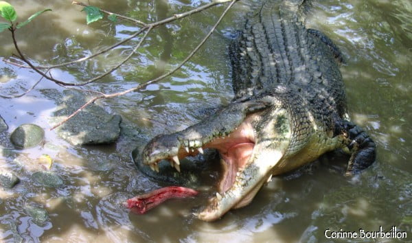 Les tronçons sont alors jetés en pâture aux crocos qui croupissent derrière de hauts murs dans une mare gadouilleuse.