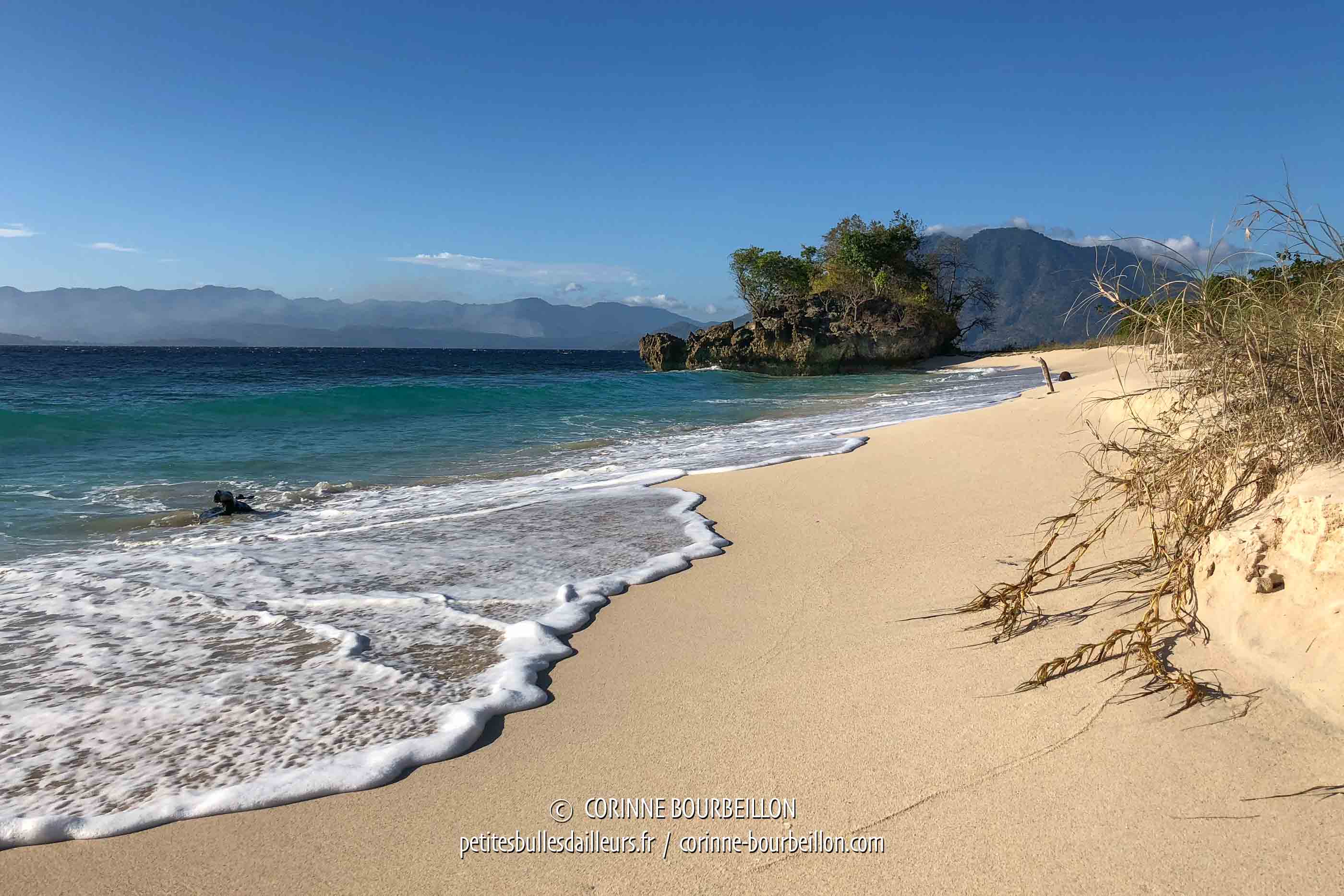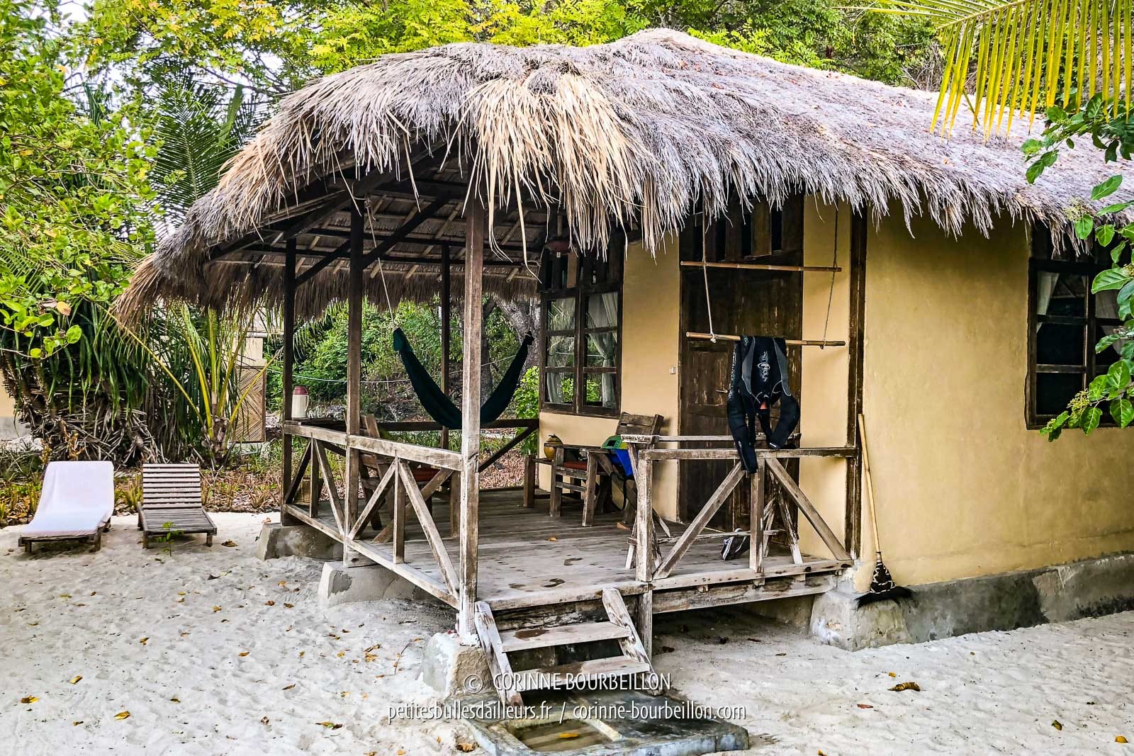 We stay in simple but comfortable bungalows, with terrace, hot water and all the necessary electrical plugs for recharging the batteries. Hidden in the vegetation, they preserve intimacy, well away from each other, facing a deserted beach. On the horizon, the conical profiles of the volcanic islands of the archipelago. It is beautiful!