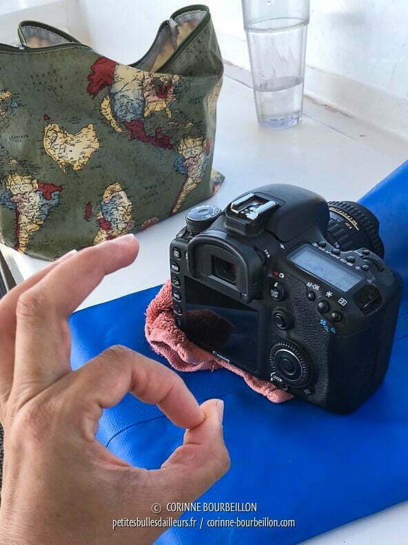 I came back to the surface just in time! When I took the SLR out of the housing, I was relieved to see that the water inside had only grazed the lens glass in the dome. Neither the camera nor its support containing the electrical circuits connected to the flashes were wet. Phew!!!