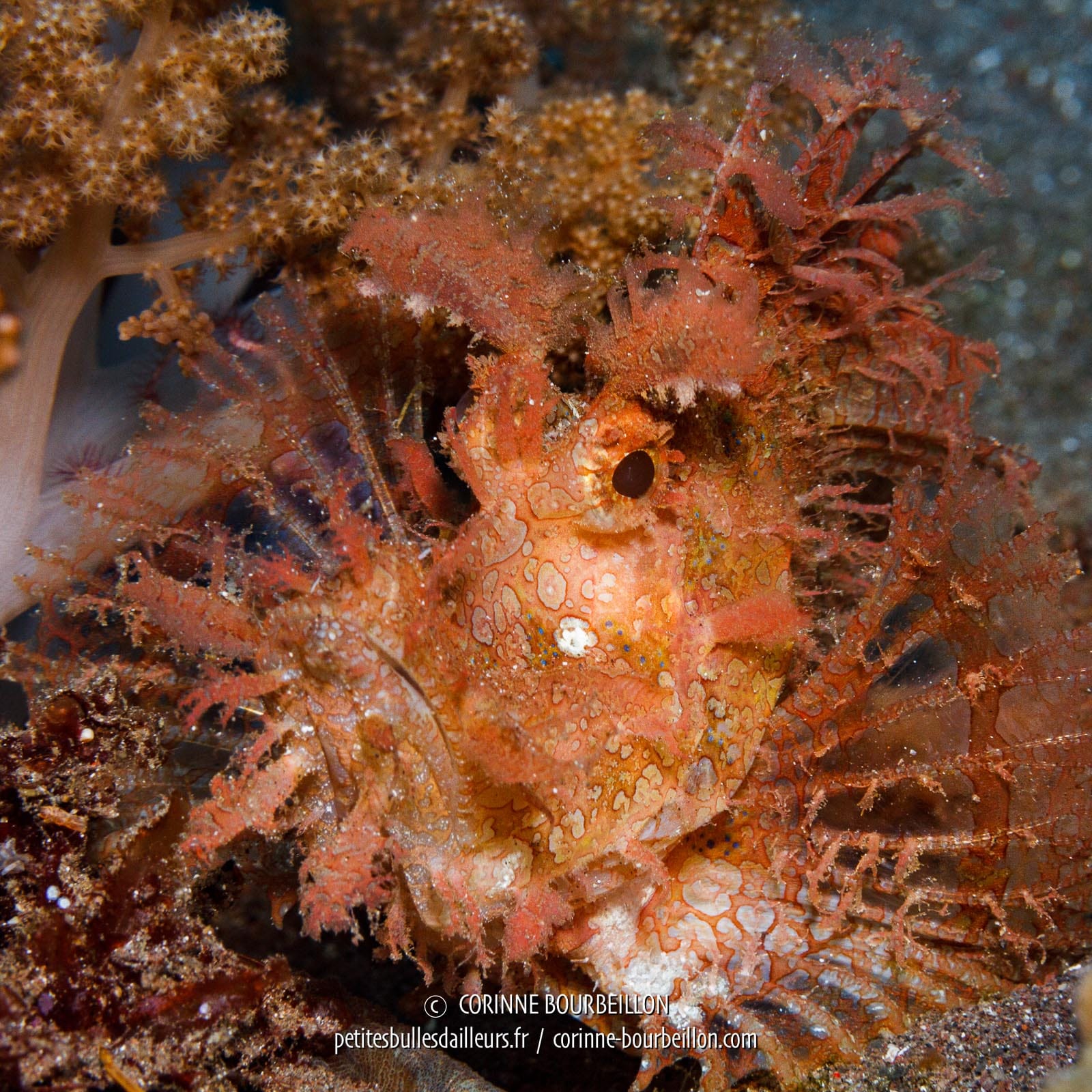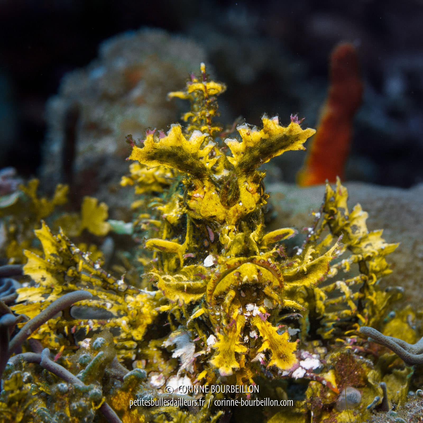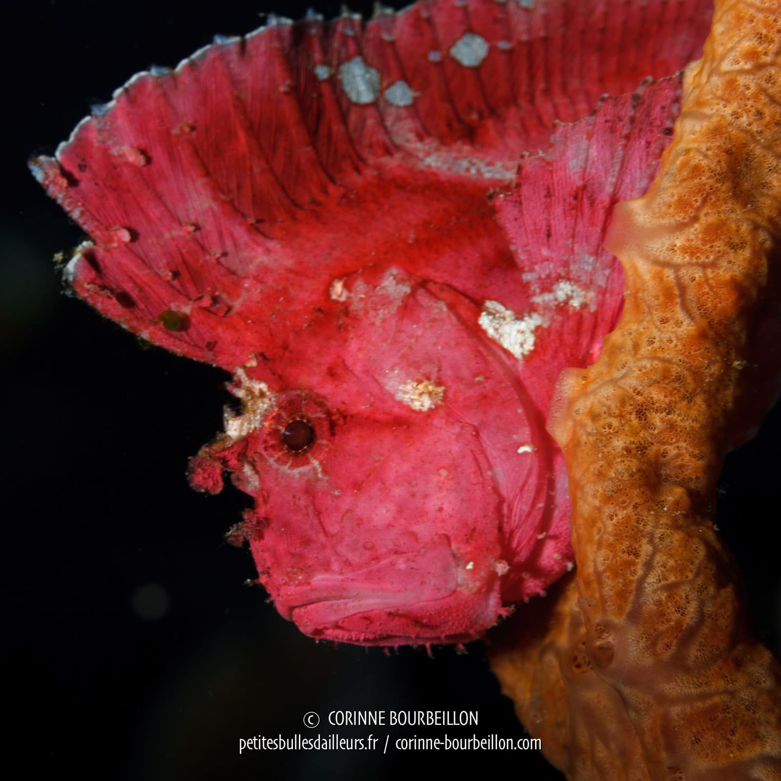 We saw our first Paddle Flap Rhinopias, one red and the other brown, a yellow Weedy the same as on your picture, frogs fish, and the magnificent Sea Apples, these red, blue holothurians with golden braids, they are of any beauty when they open their 10 arms, without comparison with those which we usually see, brown or black.