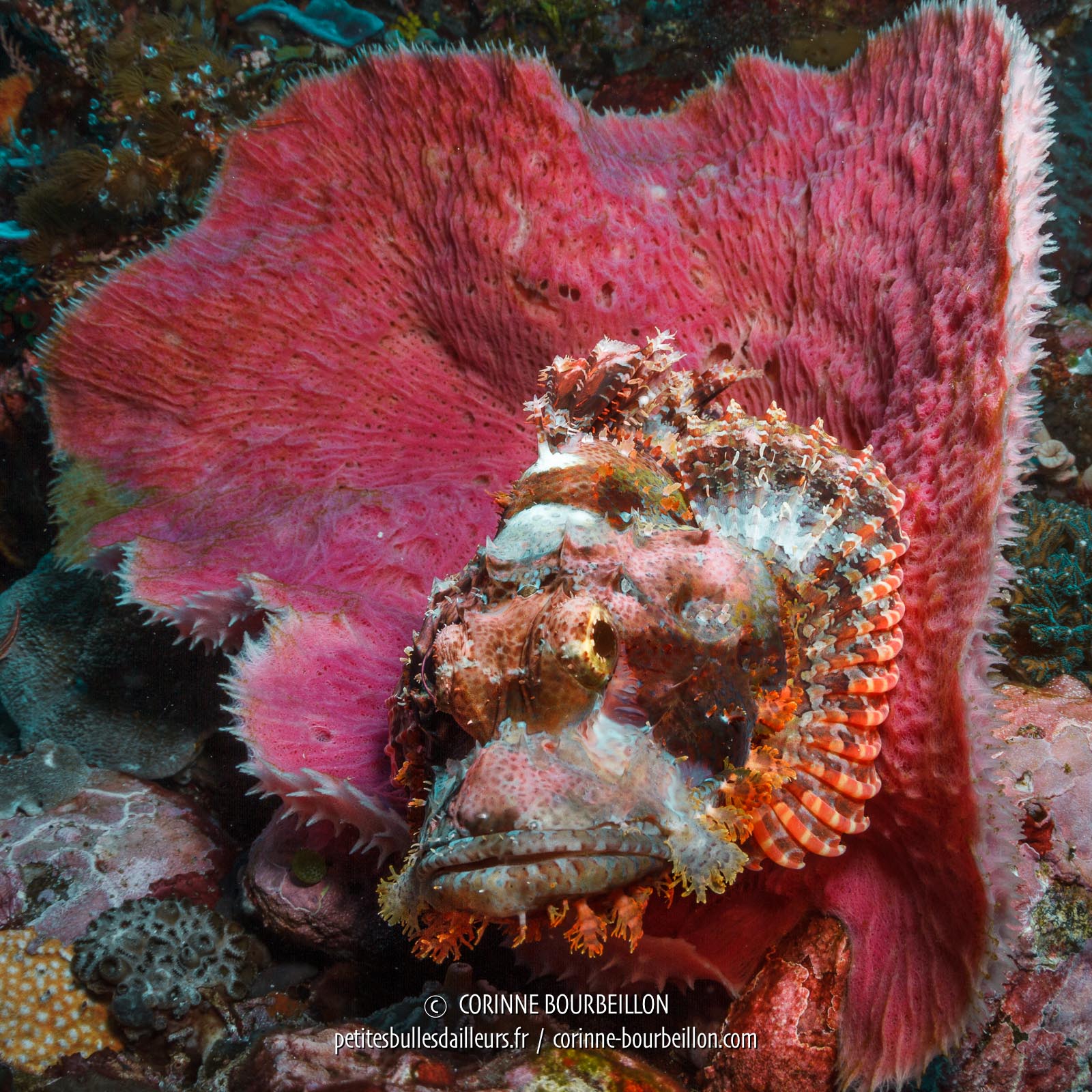 The drama unfolds in 15 meters of water, after 30 minutes of a quiet dive, on a site protected from the current. I am in front of an imposing pink barrel-sponge on which is perched a white leaf-fish, very photogenic, that Dena, Alor Divers' Dutch instructor who is accompanying our group, has just shown me...