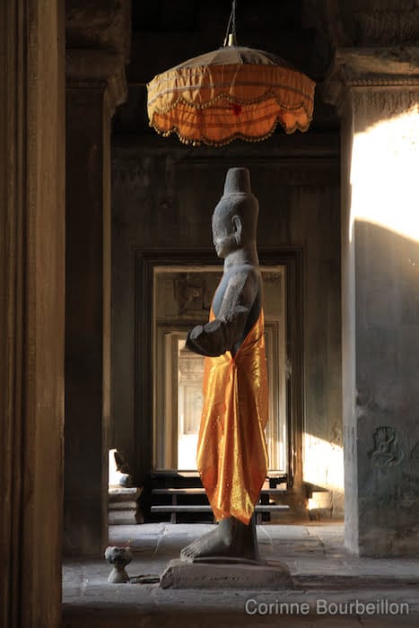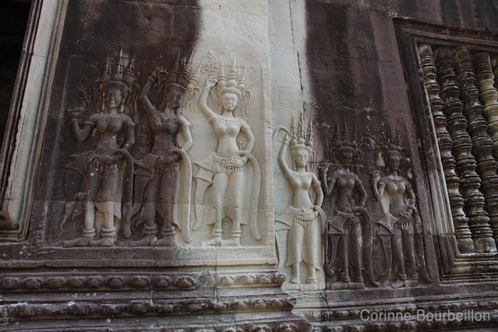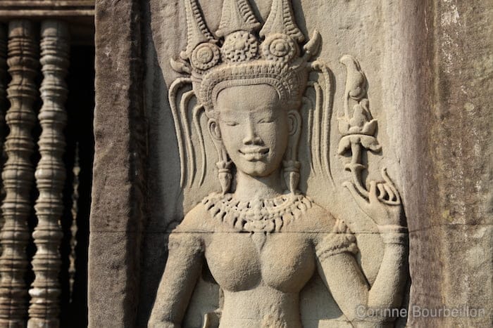 I prefer the elegant sculptures of the apsaras, the celestial dancers, with their hairstyles worthy of modern mangas and their enchanting smiles, to the interminable mythological fresco that runs around the gallery, like a stone comic strip.