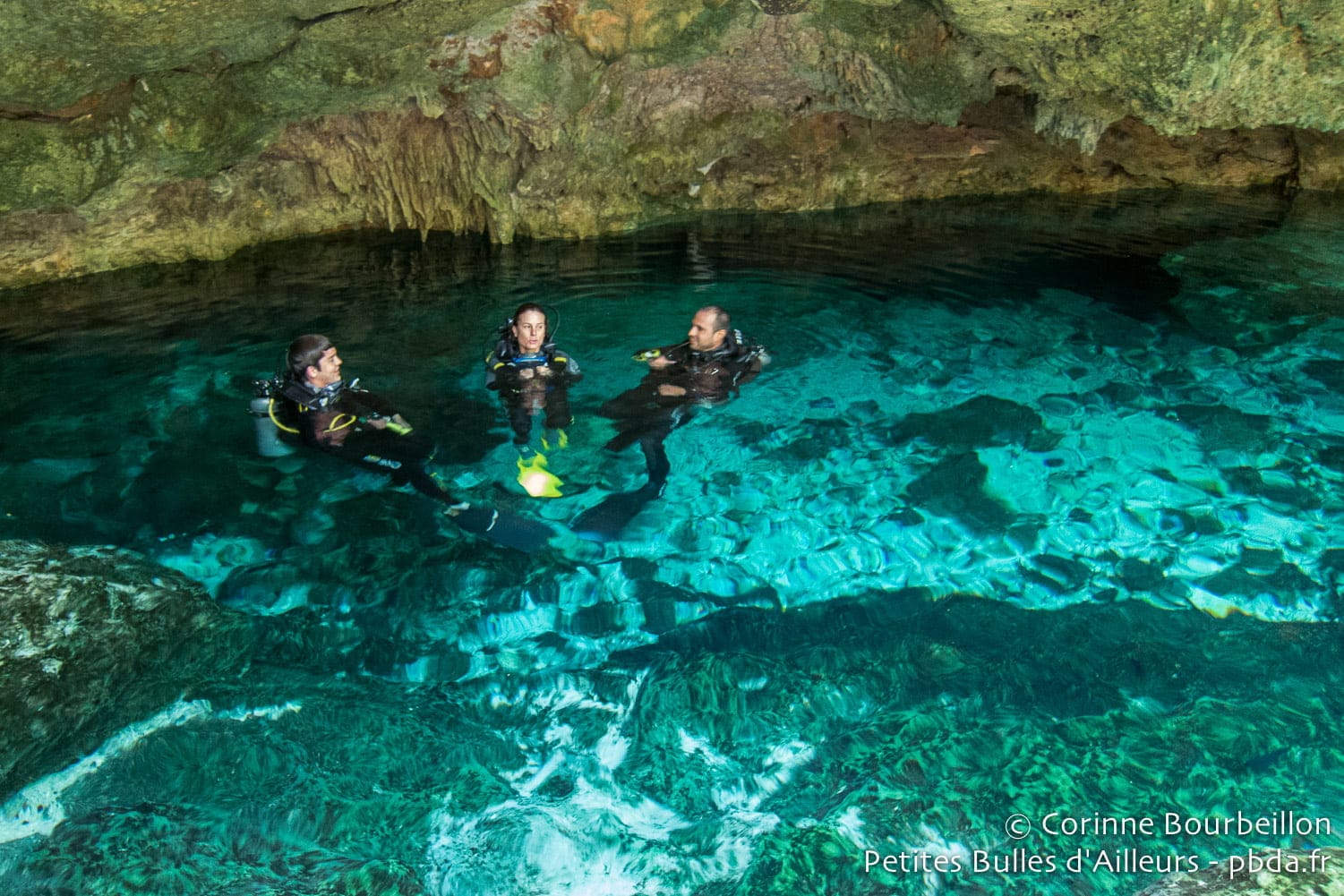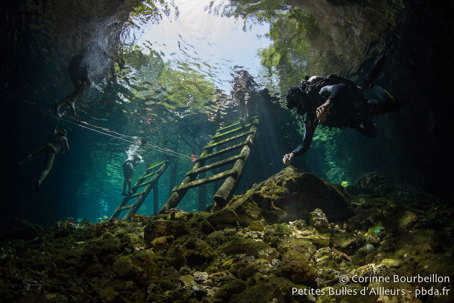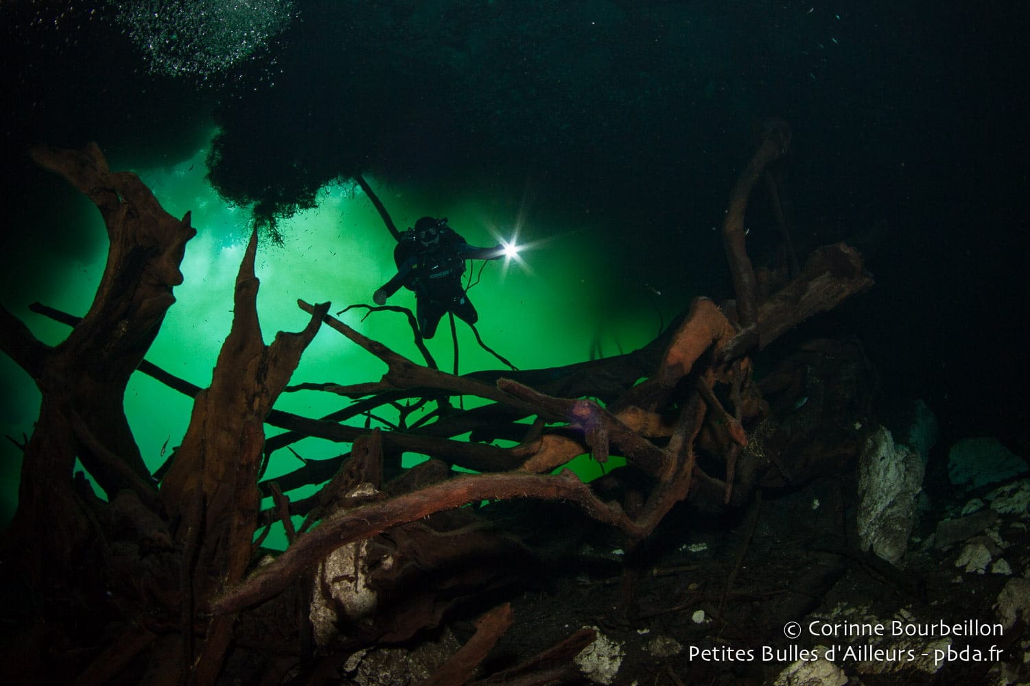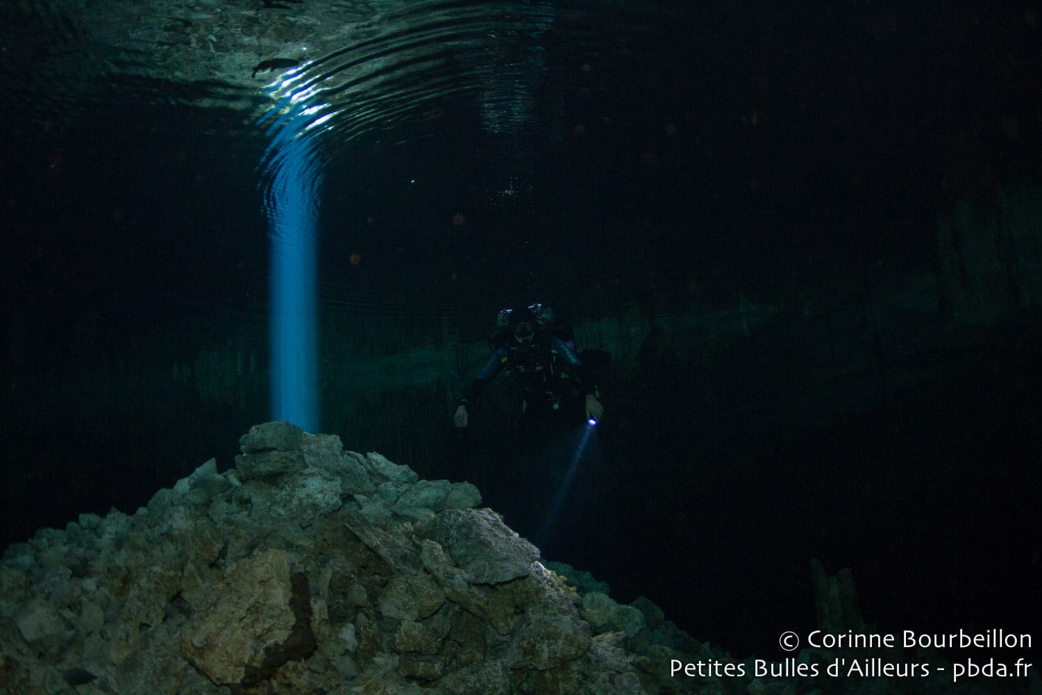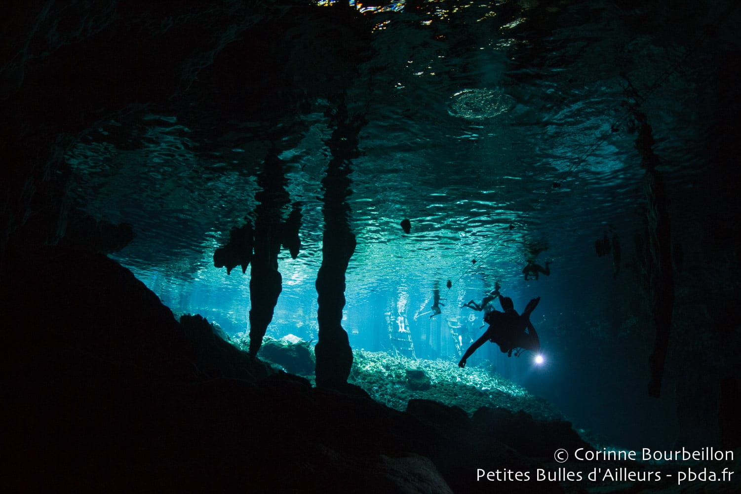 I don't have a picture that can show you that... You look down and up, you feel like you are going in and out of the water. But not at all. We are always immersed. Very disturbing, very disturbing. This is called a "halocline". Fortunately I had been warned about it before diving, because at the time my poor brain could hardly understand what was happening. Especially since the phenomenon in question occurs when we are in a totally underground environment, without any external light. Almost frightening, I admit.