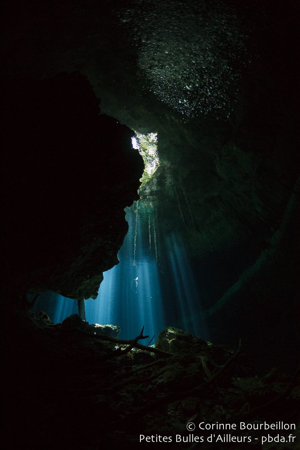 Some cenotes give access, via galleries full of water, to underground rooms, whose ceiling is pierced by openings, more or less wide, to the outside. When the hole is small, the sun rays that pass through make like blue laser beams in the water!
