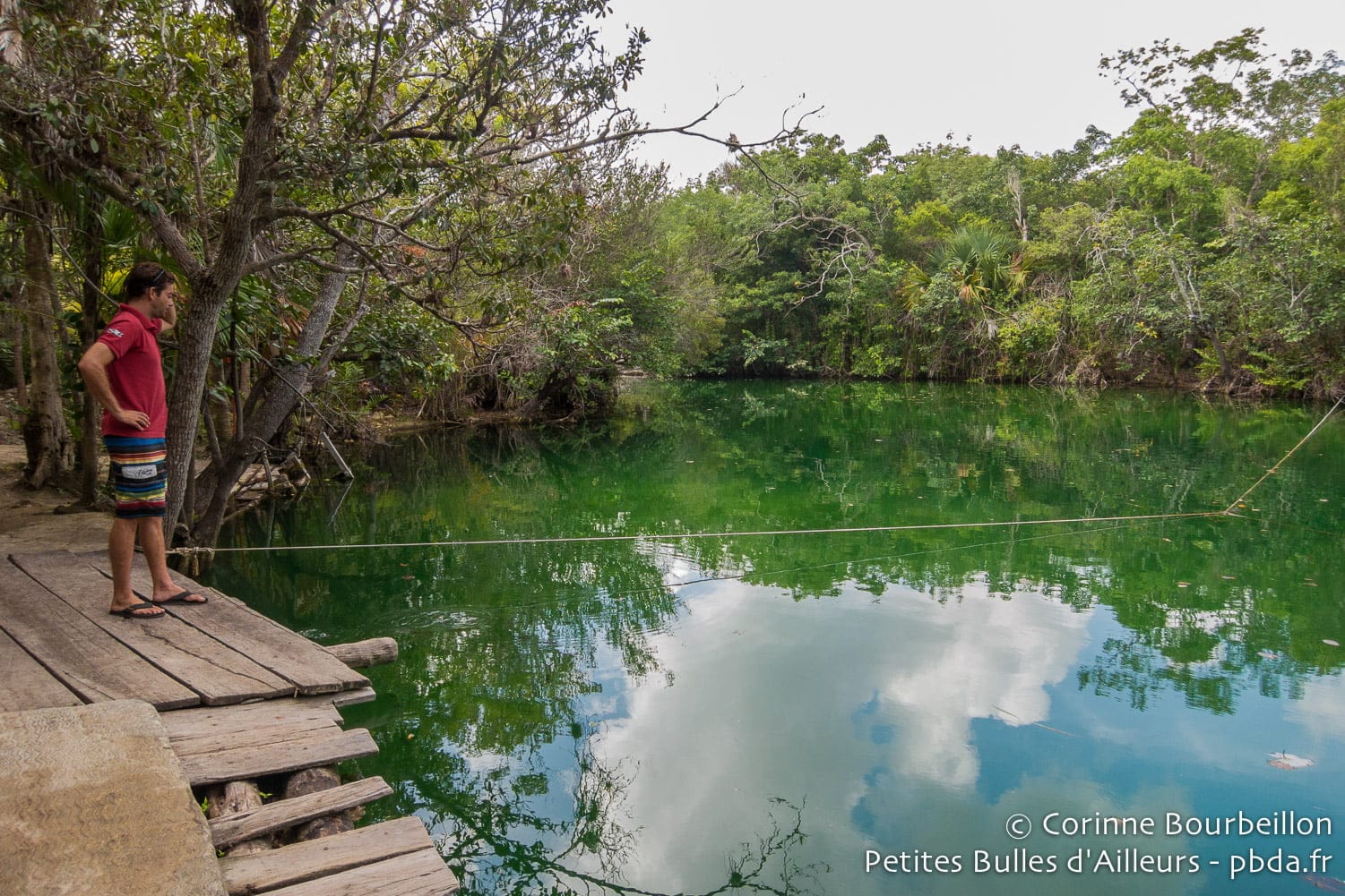There is a small crocodile, a real one, that lives in this cenote. I was hoping to at least photograph its silhouette against the light. But he was hidden somewhere, in the mangrove, and did not deign to play the extras... So Clément paid of his person and took the pose for my photos.