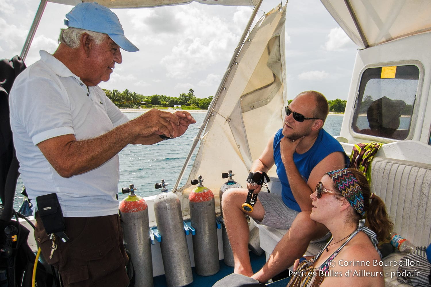Between two dives, it's a "salsa-guacamole-ham-cheese-fruit" picnic on the boat Aquarama. The atmosphere is relaxed and international.