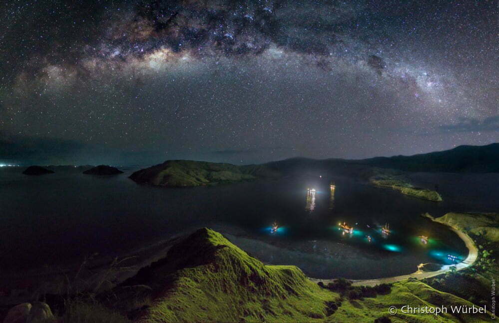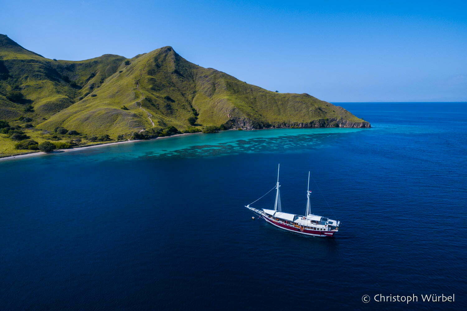 The images taken from above show the typical landscape of the archipelago: steep hills covered with savannah, which drop down to white sandy beaches and azure waters, where coral outcrops. The vegetation shows that the climate here is much drier than in other parts of Indonesia.