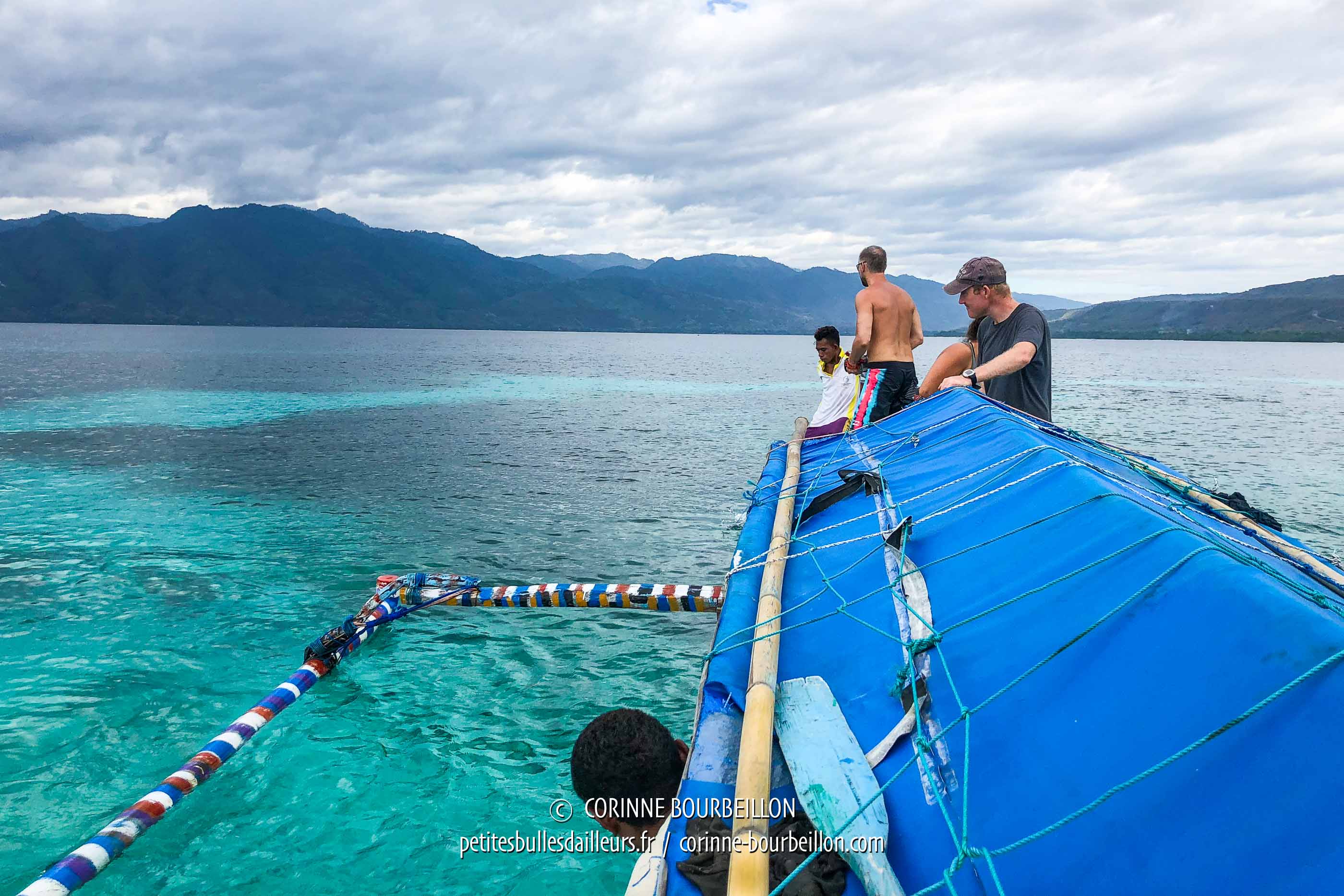 Steven and I were met at a beach, where a narrow, multi-coloured traditional boat was waiting for us, its outriggers being PVC tubes painted with blue and white stripes. We quickly put on our wetsuits and leave the rest of our stuff in the car of the guy who gave us a lift.