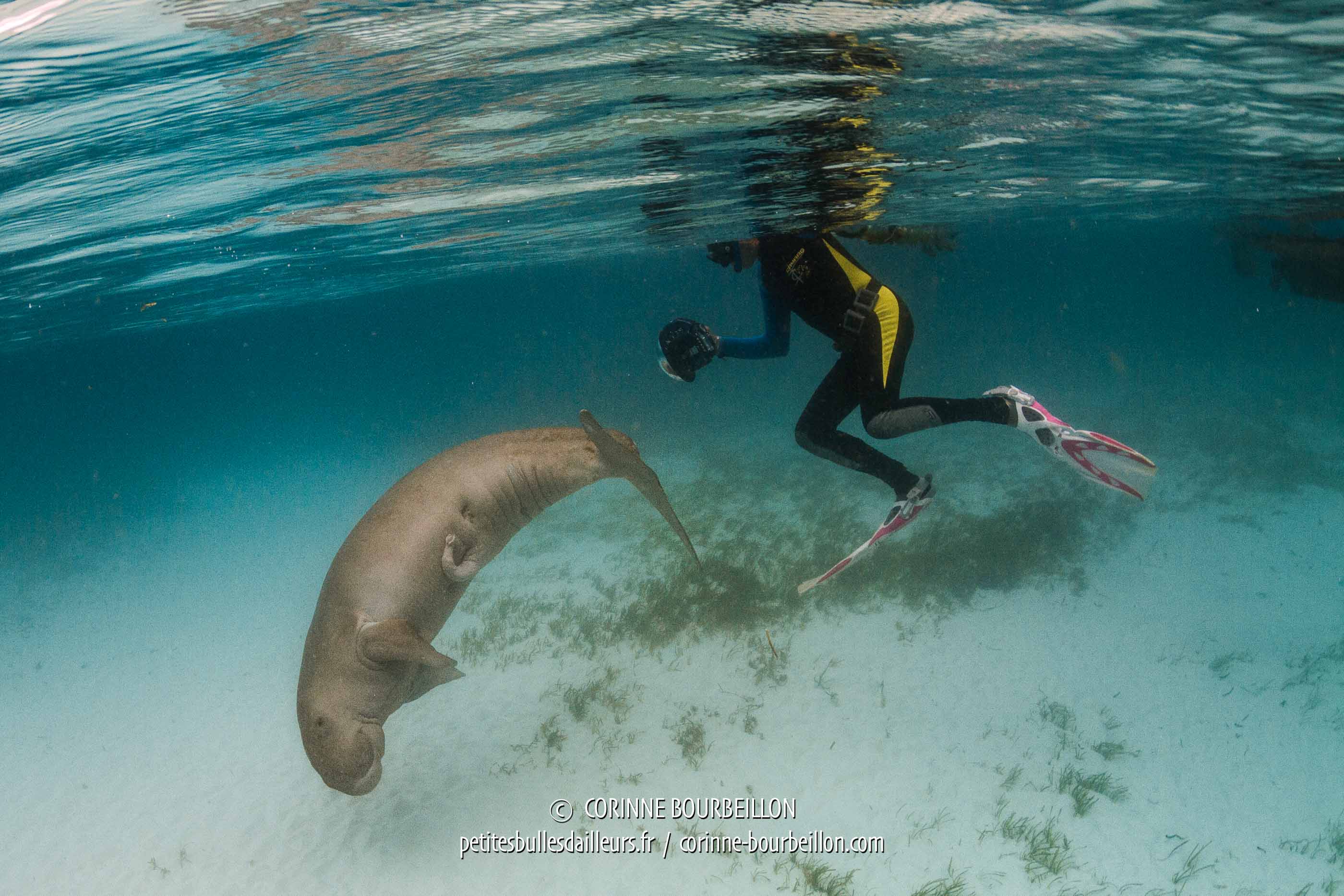 Disappointed by my lack of reaction, the animal prefers to throw its devotion on Steven more boldly hung on a pendulum a few meters from me. We discover then the passionate assaults of which is capable a marine mammal towards a marine biologist... 😂 Not so easy to take pictures of such an enterprising dugong.