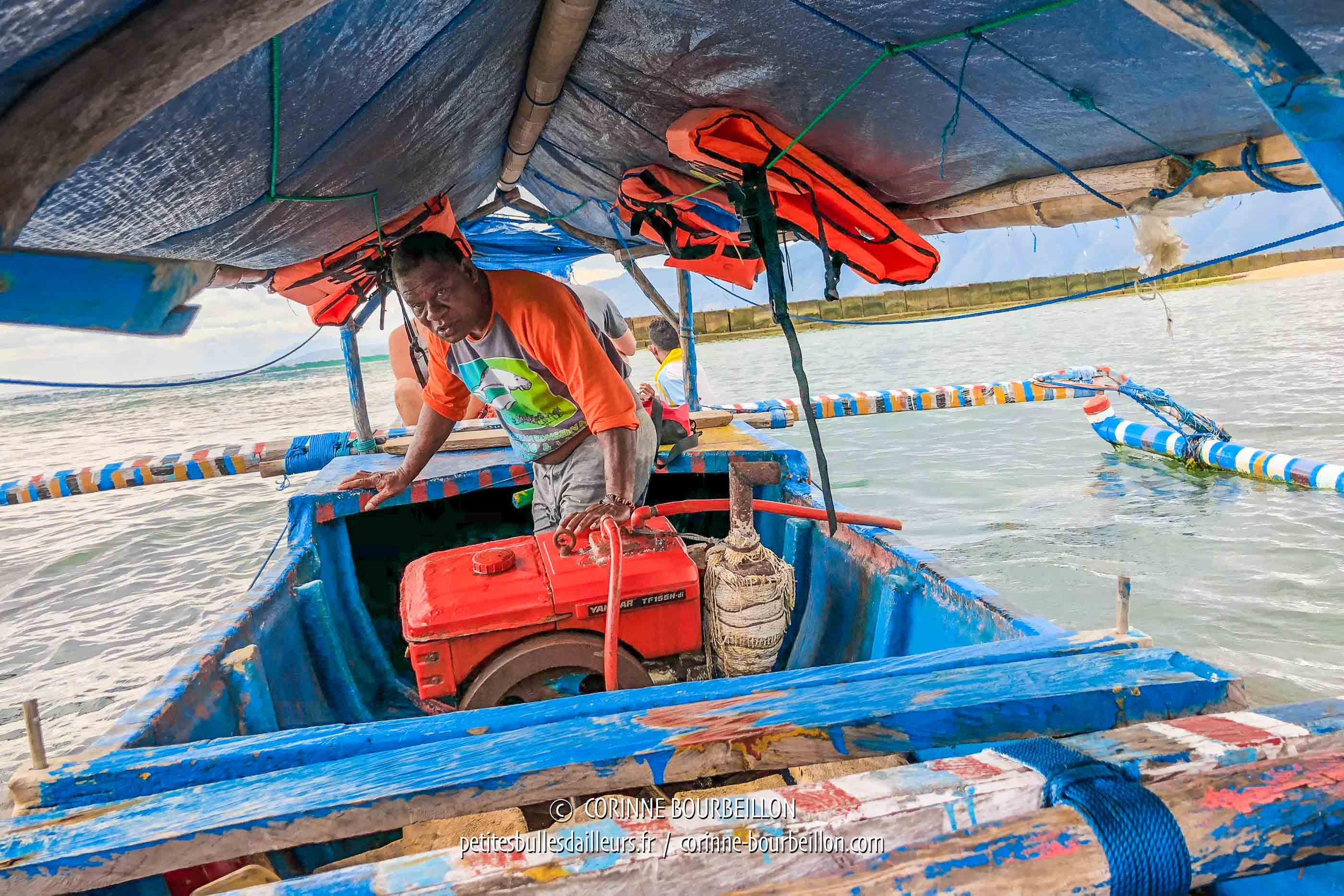 With us, there are three other tourists, Americans, installed at the bow. The salvage engine that turns the propeller backfires loudly. Once off the coast in the shallow bay, the gruff captain starts chanting towards the sea. We can guess that he is calling the dugong, in his own way...