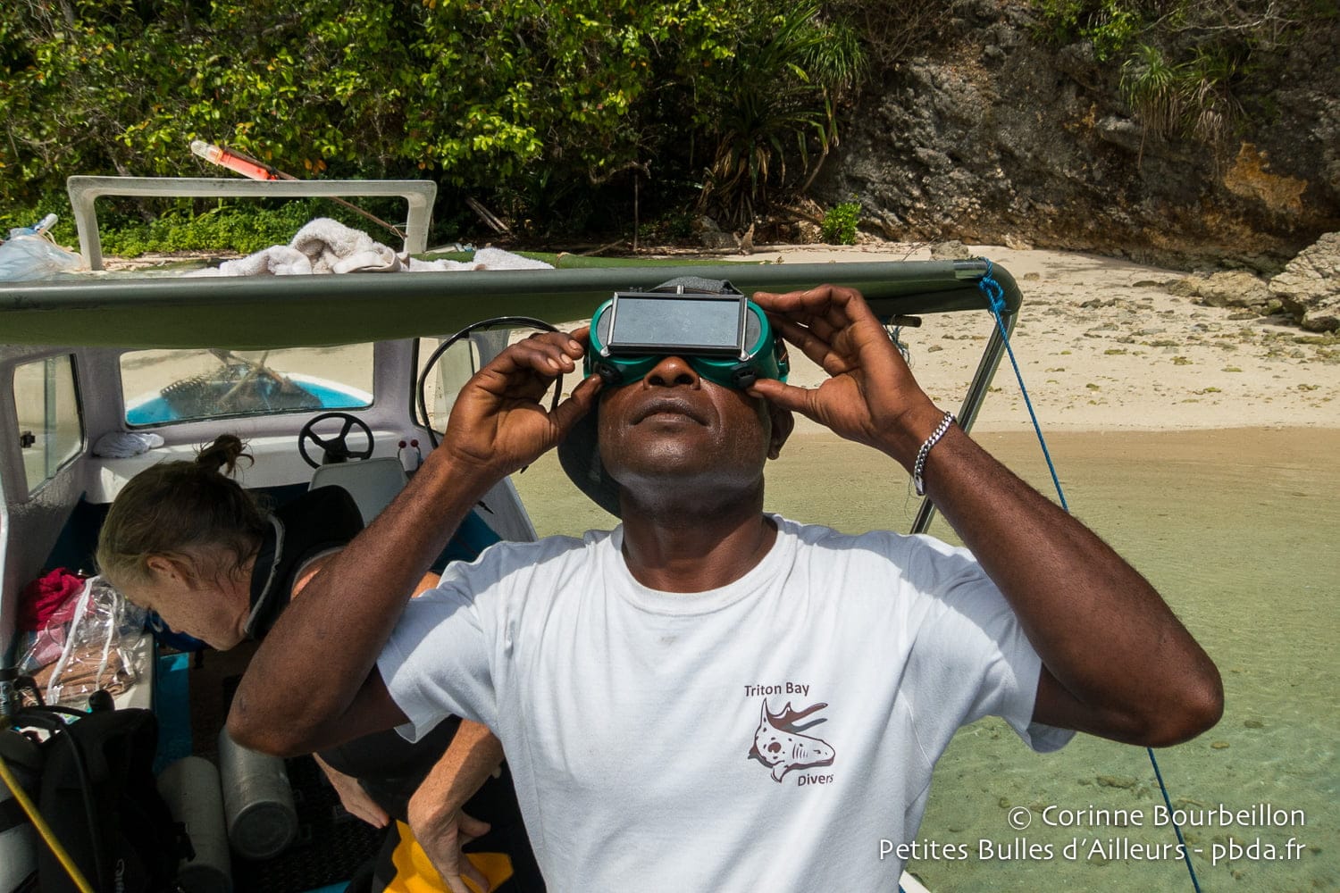 One regains the boat, one is unequipped and one accosts on a small sand creek, for the interval of surface. Lisa fumbles in her things and takes out two protective masks in green plastic, provided with an opaque visor also in plastic, kind of mask of welder cheap. "That's all I could find here, she tells me. Better not to stare at the sun for too long, it's not really suitable, I think."