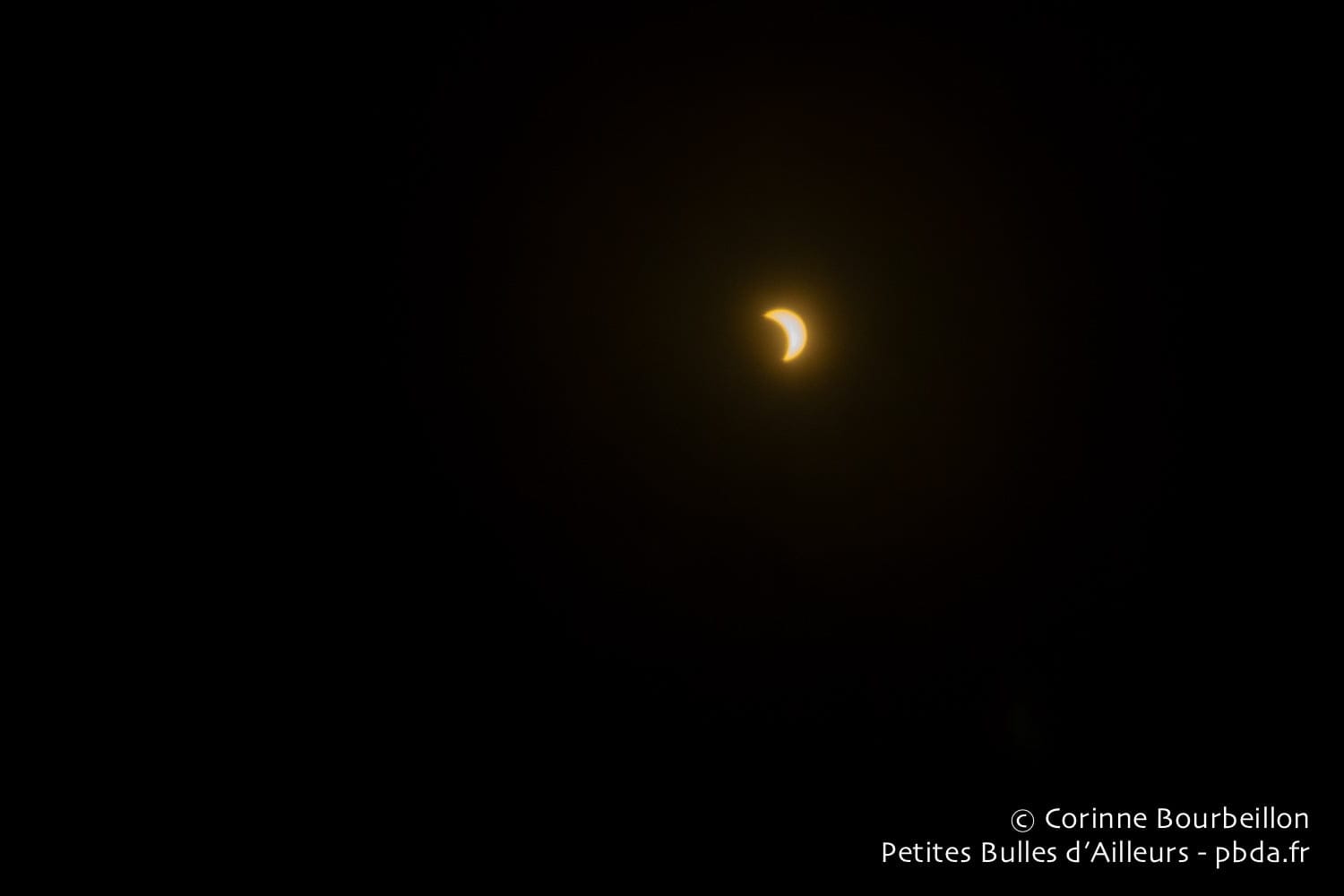 My SLR camera is in its watertight casingFor underwater pictures, with the macro lens... Useless, then. But I have my little compact camera in my bag for souvenir pictures. Quickly, I try to make a picture before it's too late. I stick the lens inside the opaque filter. The result is not great, but I am happy to have managed to immortalize the moment, before the eclipse ends.