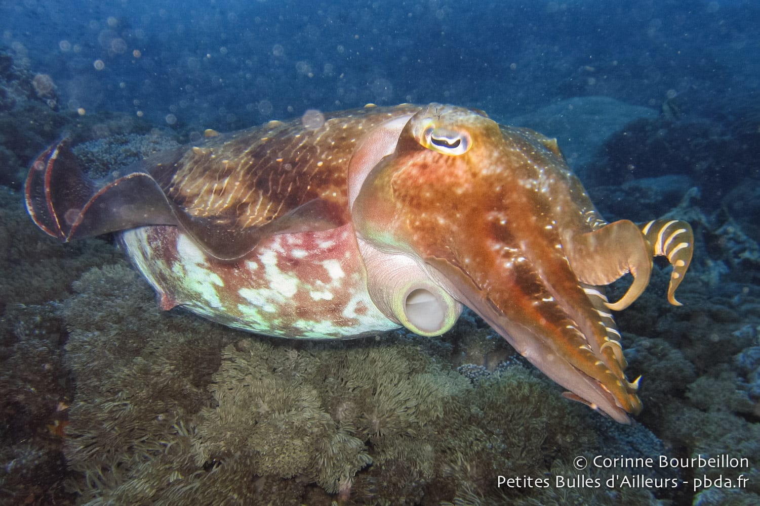 What a beautiful day! On our first drift dive at Pura Mas Gading, we also came across a large, placid cuttlefish. Despite a furious current, I clung to the reef and managed to get a good shot at it.