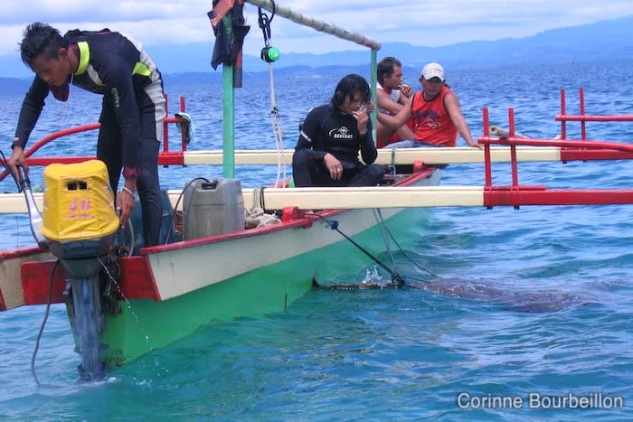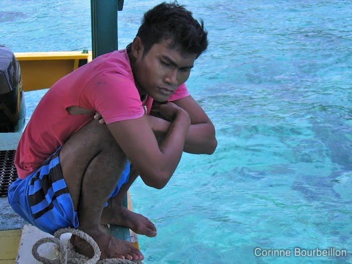 On the small outrigger boat approaching ours, fishermen with hookah. I spot the regulators and the small compressor. I didn't really manage to find out if they were just raising traps, nor what they usually fish, nor in what conditions...