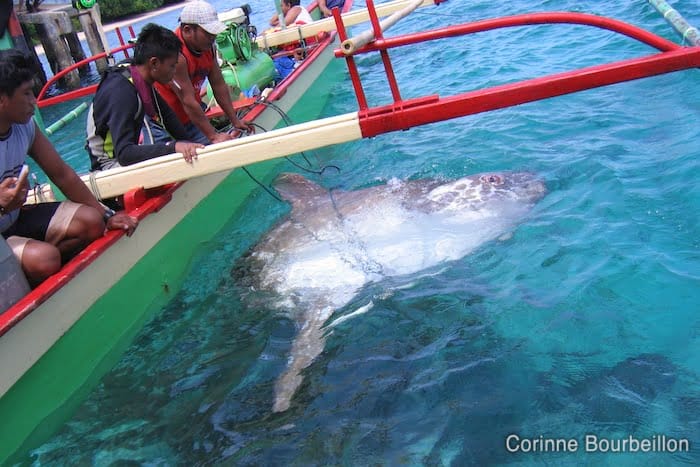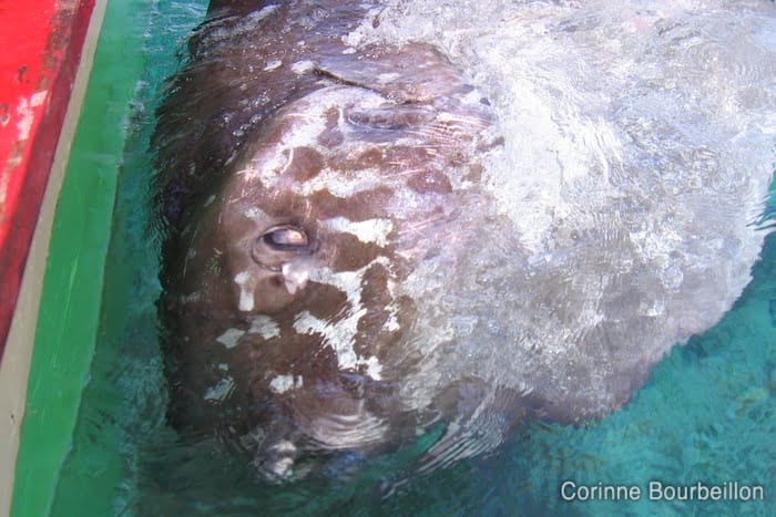 From the explanations I was able to obtain, it appears that the fishermen found this mola-mola on the surface. The fish was already in bad shape, they had no trouble catching it and attaching it to the hull of their boat.