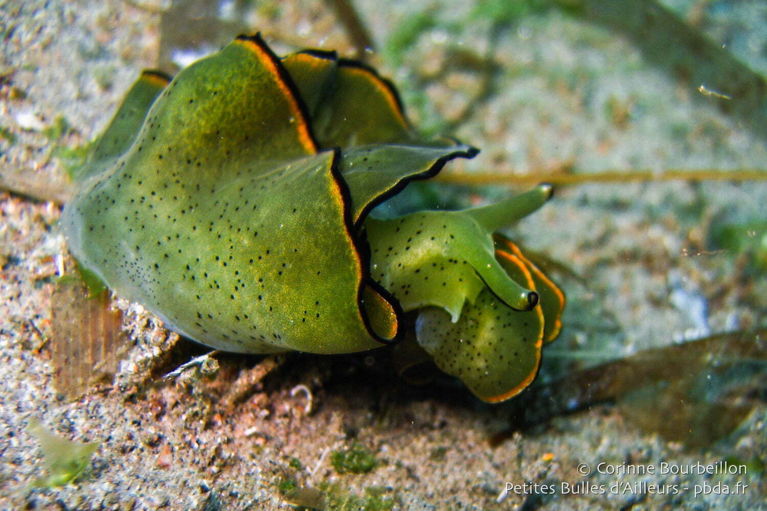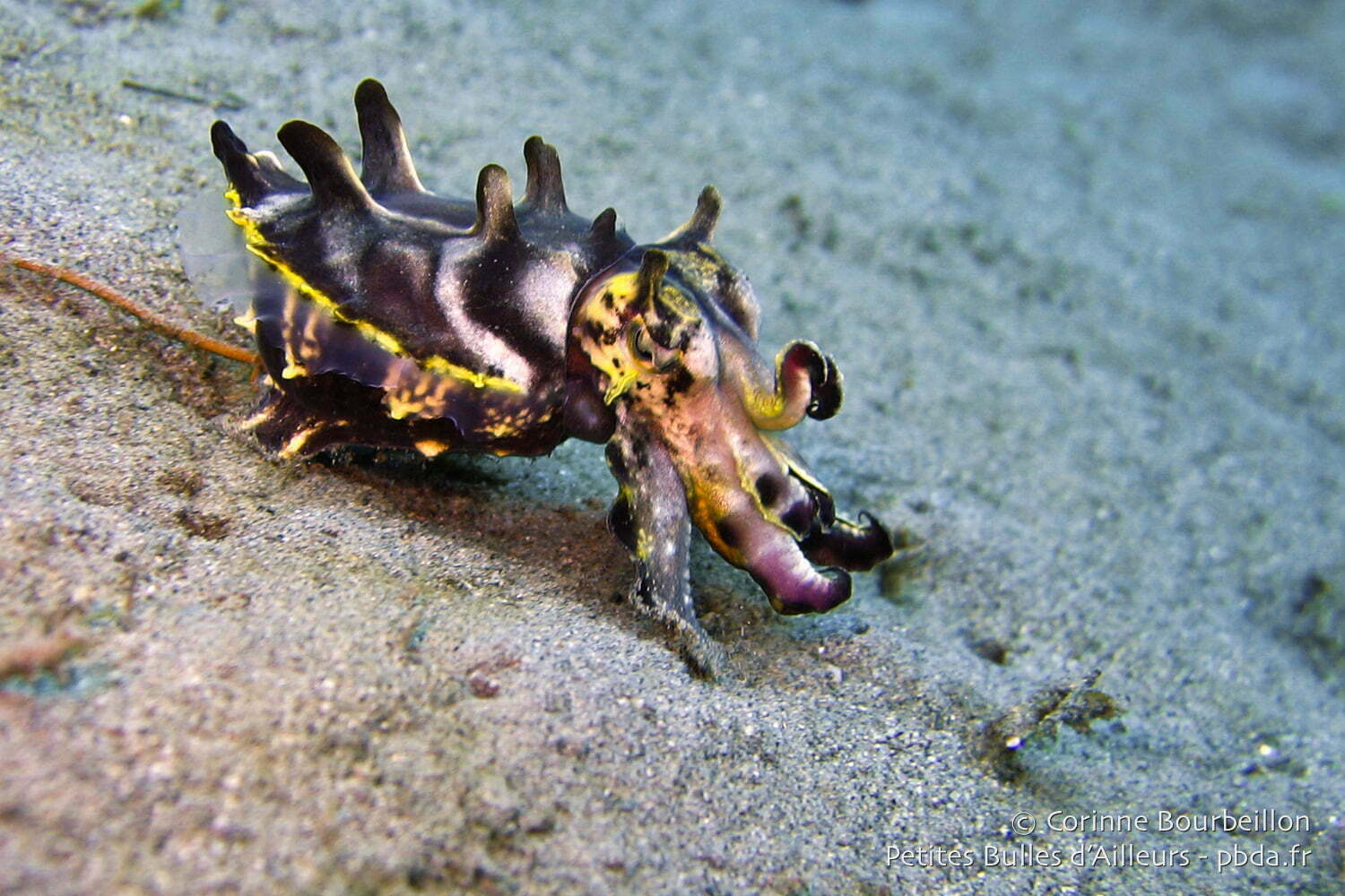 I love flaming cuttlefish, with their amazing color changes. This was the second time I encountered them underwater. The first time was this summer, in Lembeh (Sulawesi). This one, photographed on the site of Masaplod, in Dauin, was fleeing on the sand, frightened by our bubbles, thus offering me its best profile 😉