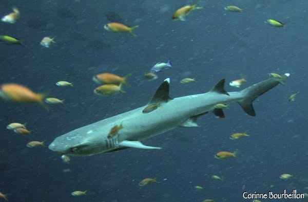 But here comes another shark, and then two others, in the other direction. Damn. I should have removed the flash. My photo is a failure, the beast went a little too far. I got tangled up with my camera, switched to video mode and filmed another white tip (See the video below, at the end of the article.)