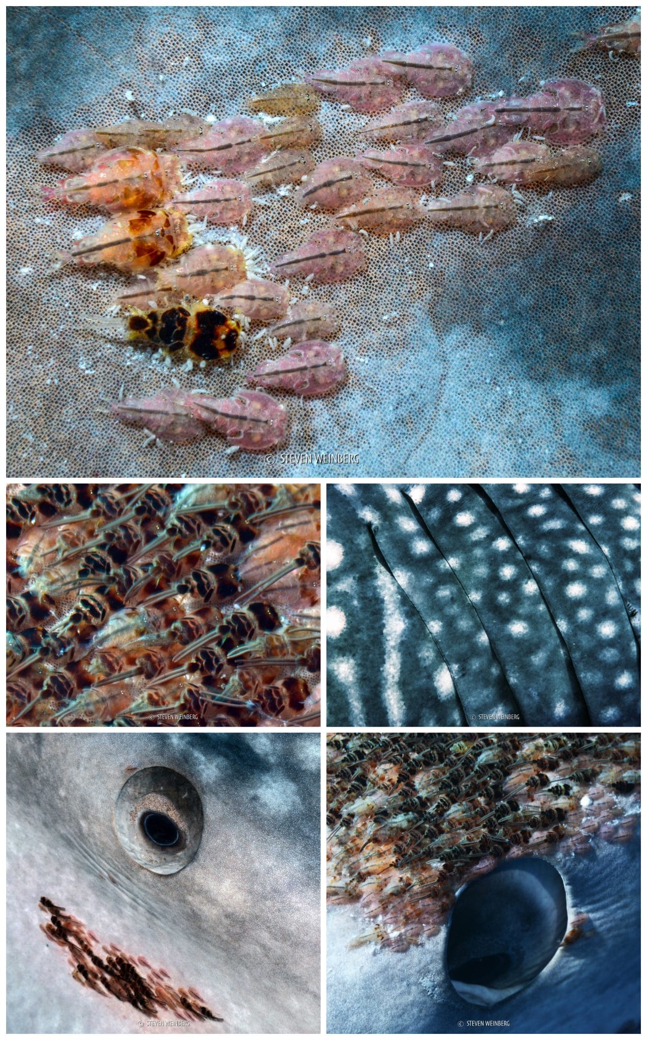 These "whale shark lice" can reach a centimeter in length and actually feed on algae and bacteria on its skin. It is therefore less a question of parasitism than of commensalismThis means that these small crustaceans take advantage of their host, but without harming it. They are a priori without danger for the whale shark, which has a very thick skin (about ten centimeters).