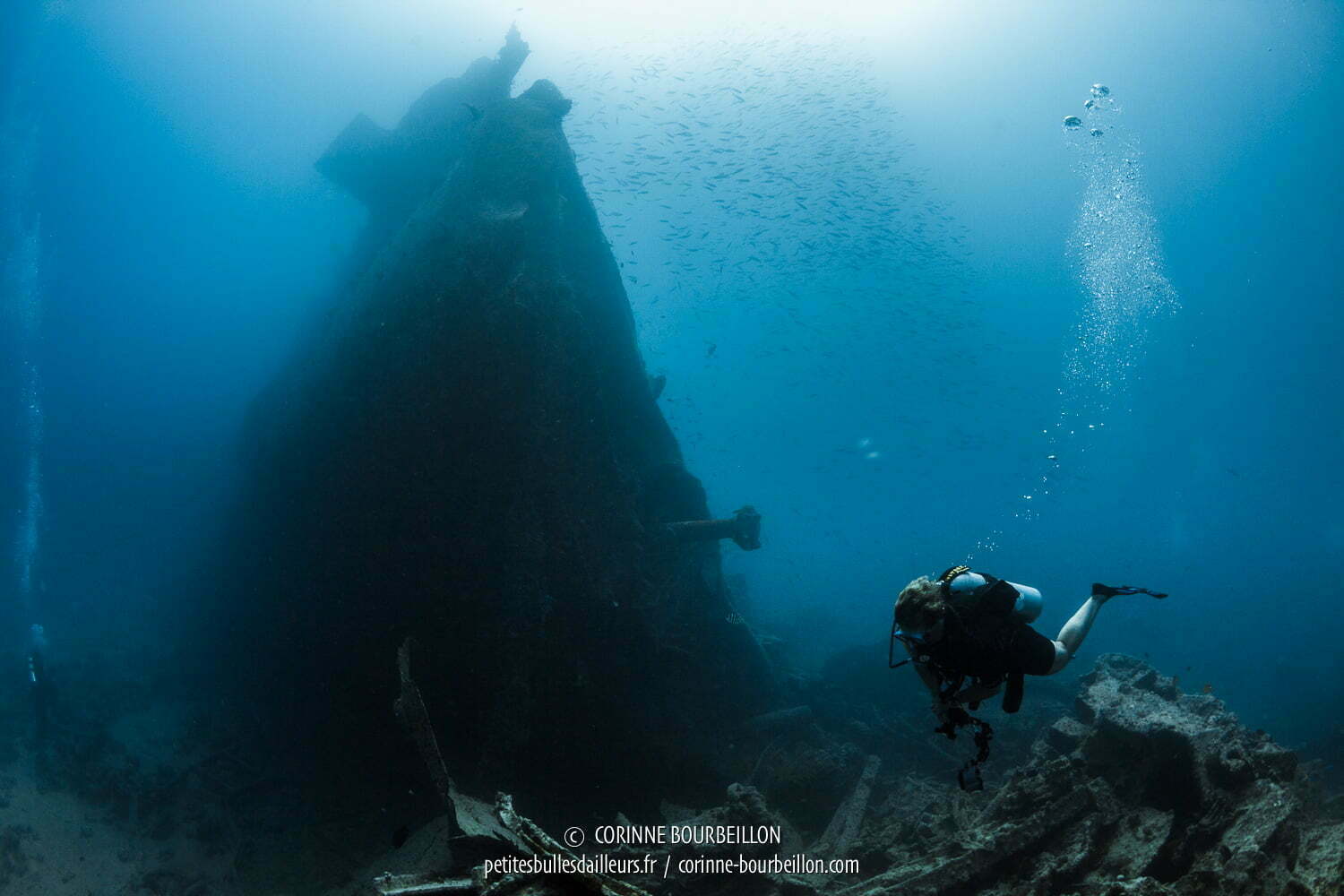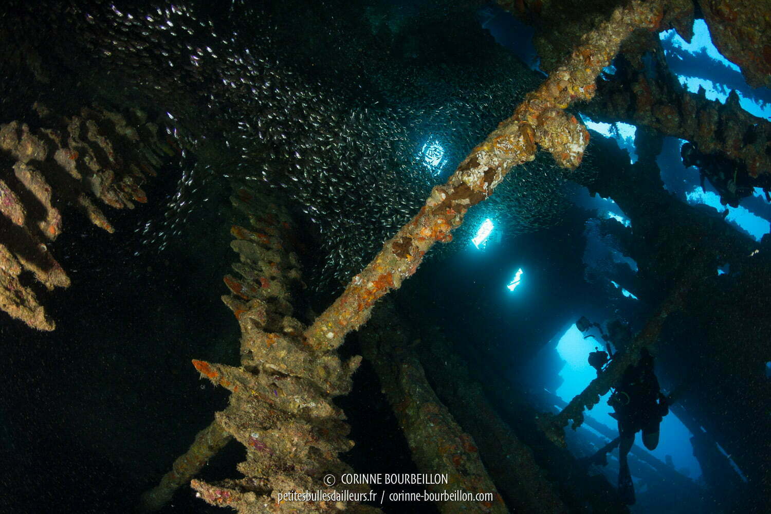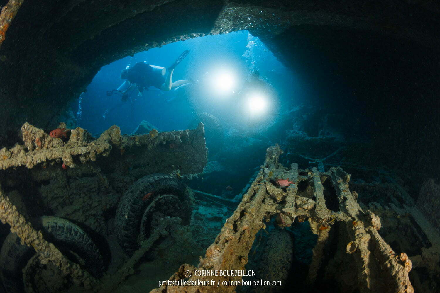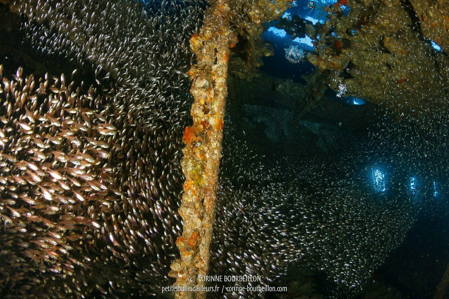Les photos sont magnifiques! On se croirait dans un autre monde!… Et les véhicules rouillés sont impressionnants! Les bancs de poissons tournoyants autour de vous sont magiques… 😉 Merci Corinne!