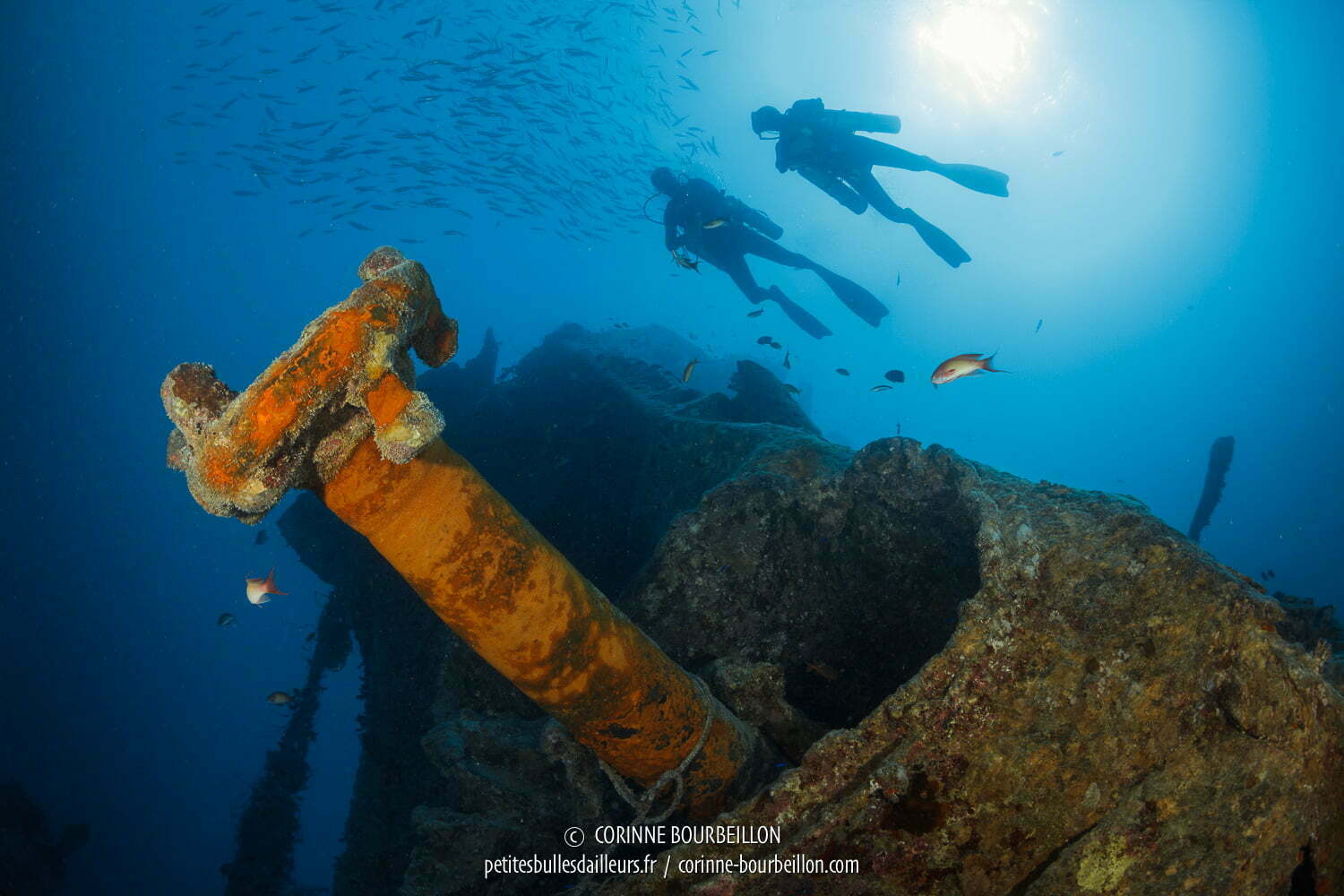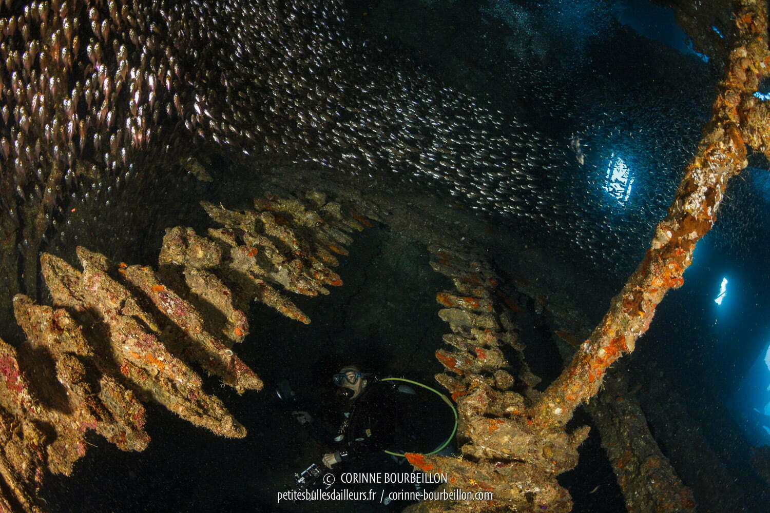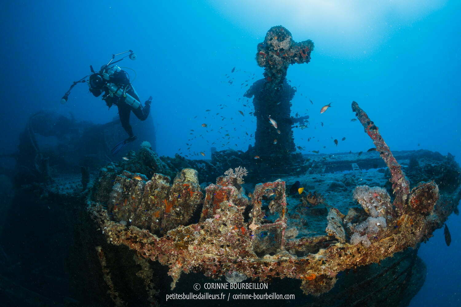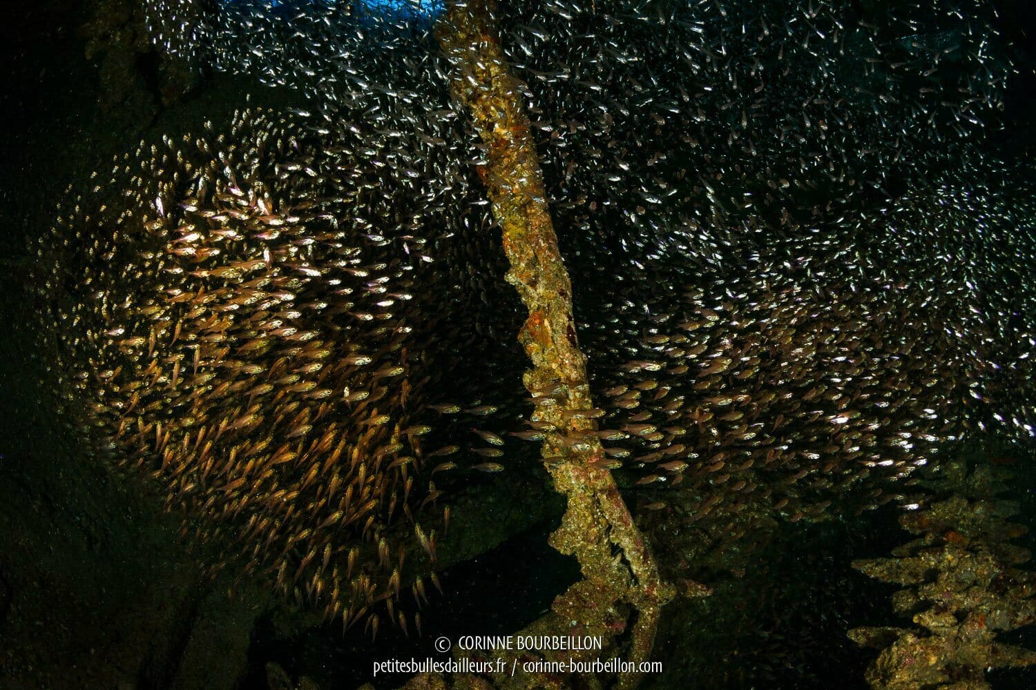 Les photos sont magnifiques! On se croirait dans un autre monde!… Et les véhicules rouillés sont impressionnants! Les bancs de poissons tournoyants autour de vous sont magiques… 😉 Merci Corinne!