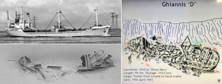 Type de navire : cargo vraquier grec. Longueur : 99 m. Construction : 1969, à Imabari au Japon. Lancé sous le nom de Shoyo Maru, il a pris celui de Markus en 1975, puis de Giannis D en 1980 lors de sa revente à l’armement grec Dumarc Shipping & Trading du Pirée. Naufrage : 19 avril 1983. Il s’est encastré droit sur le platier du récif d’Abu Nuhas alors que le capitaine dormait… Le navire avait quitté Rijeka en Yougoslavie (dans l’actuelle Croatie) et après avoir franchi le canal de Suez faisait route pour Jeddah en Arabie Saoudite, avec un chargement de bois. Profondeur : 25 à 27 m au niveau du fond, 5 m au sommet du portique.