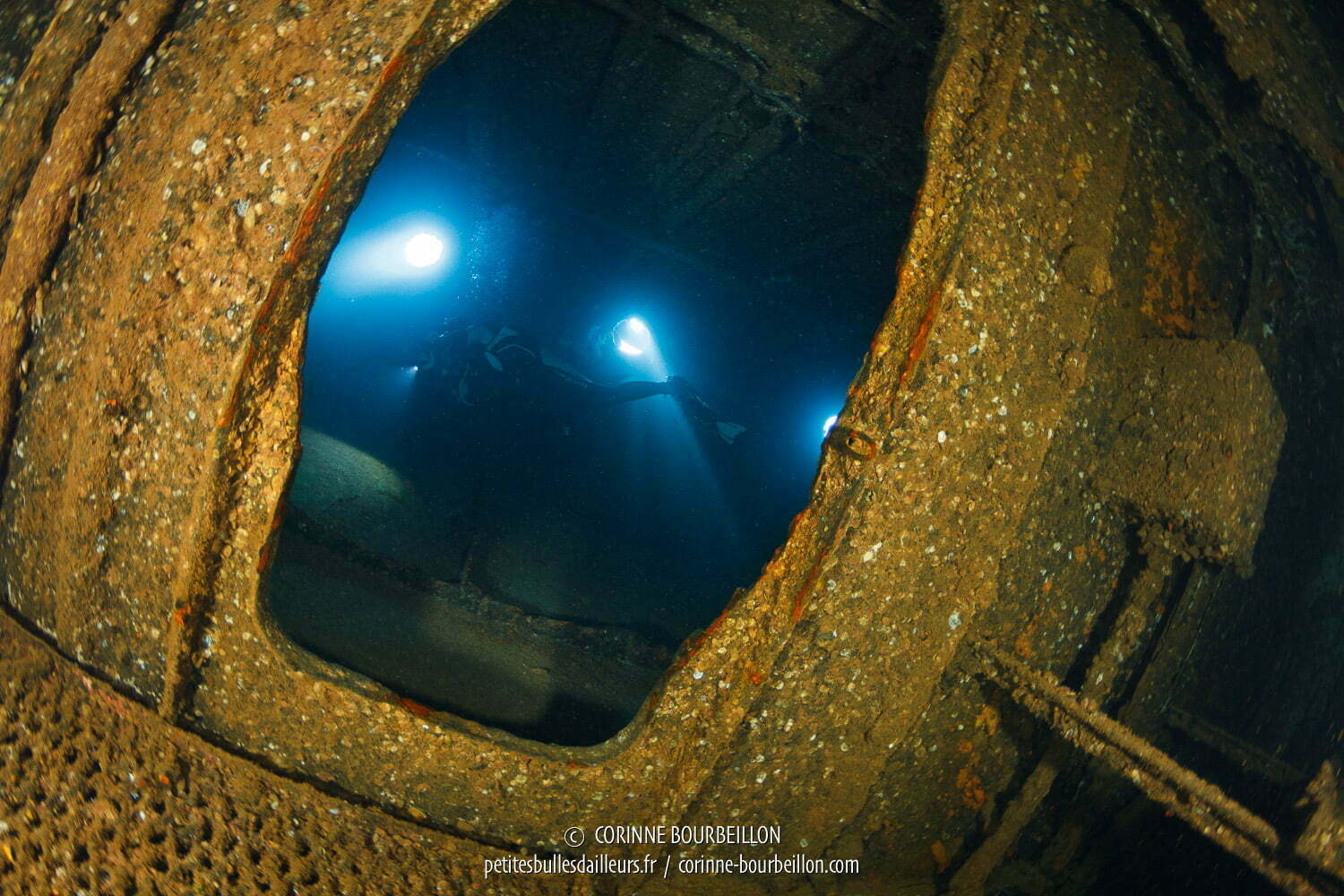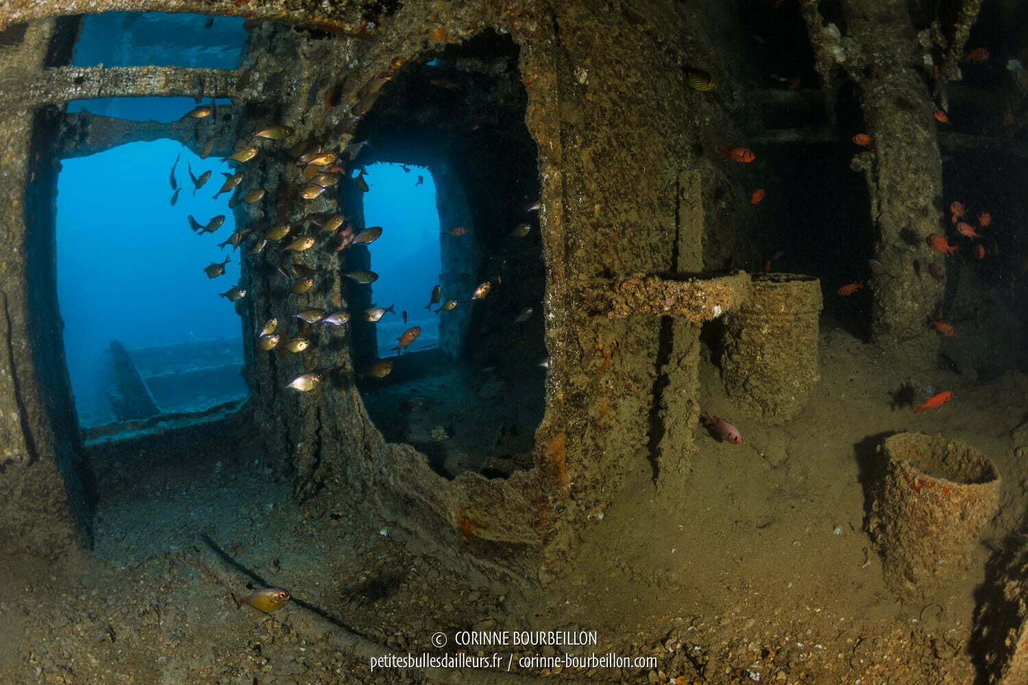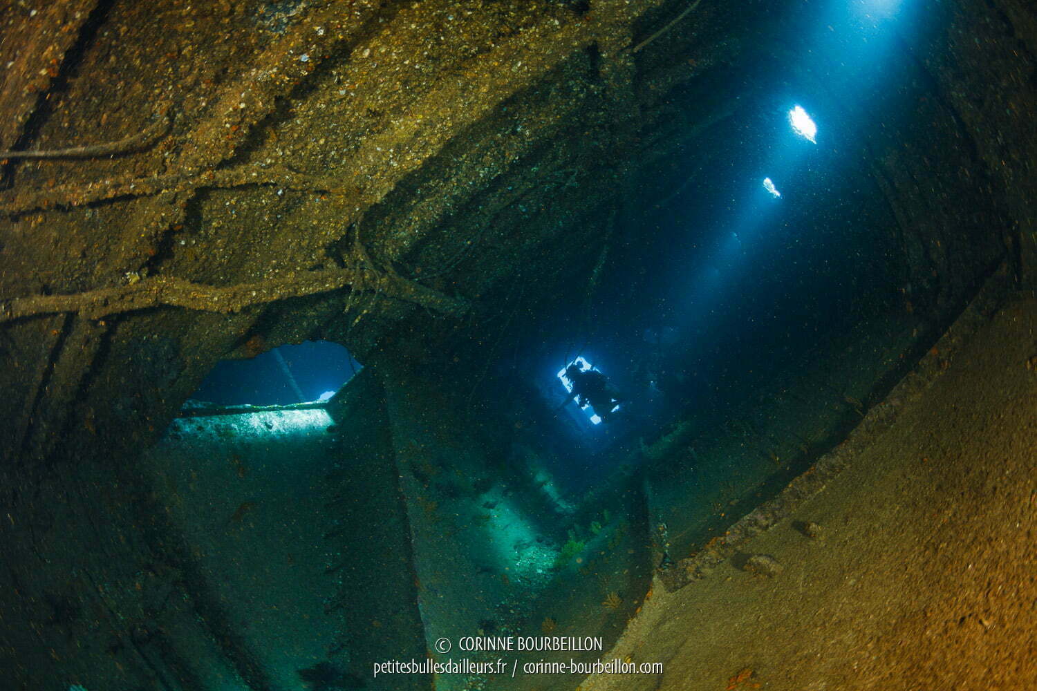 L’extérieur m’a enthousiasmée, mais l’intérieur me laisse une impression plus désagréable. Rien de difficile dans la pénétration, mais tout est incliné à 45 degrés, si bien que j’en ai presque eu des vertiges à la limite de la nausée, par moments, avec l’envie d’en sortir au plus vite… Ces couloirs penchés sont vraiment troublants pour le cerveau ! C’est une sensation assez déplaisante, que ressentent beaucoup de plongeurs dans cette épave. Mais les lieux sont vraiment extraordinaires, avec quantité de détails à observer, et je me suis concentrée sur les jeux de lumière.