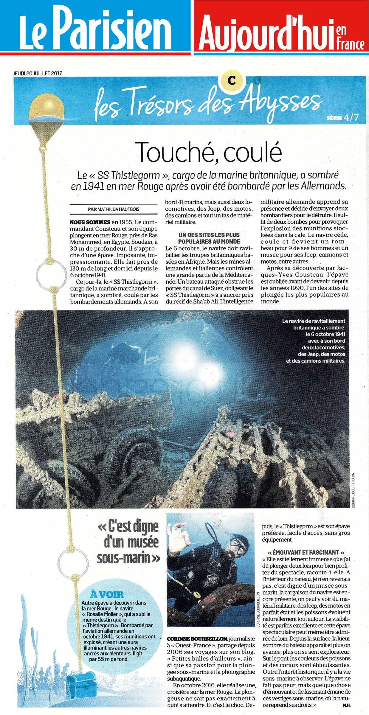Mise à jour – juillet 2017 : grâce à cette épave, je me suis retrouvée dans le journal Le Parisien, qui m’a demandé de témoigner pour une série d’été ! Une copie de la page est à voir ici → Les trésors des abysses : touché, coulé. La version internet de l’article est là → Plongée : l’épave du SS Thistlegorm, navire coulé en mer Rouge en 1941
