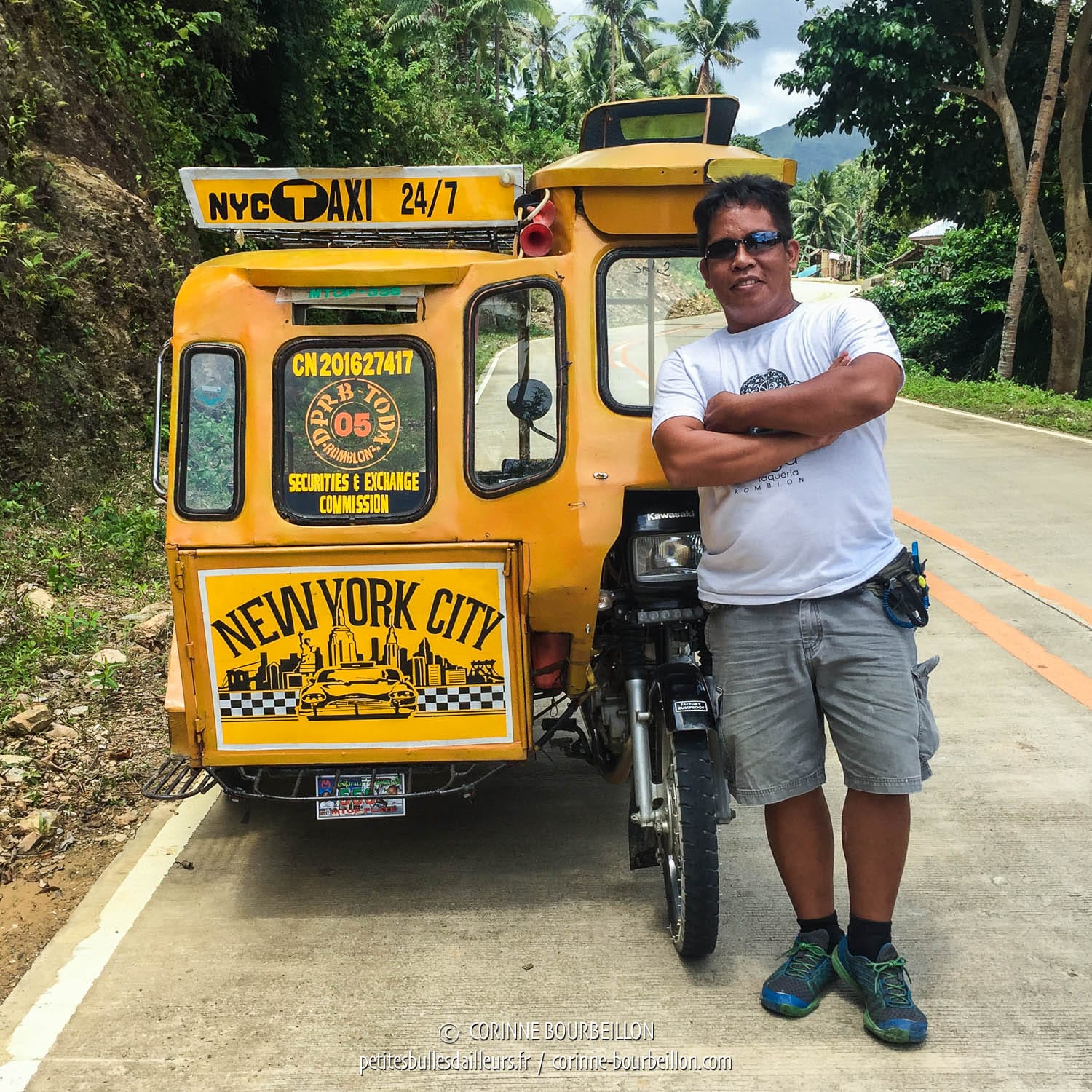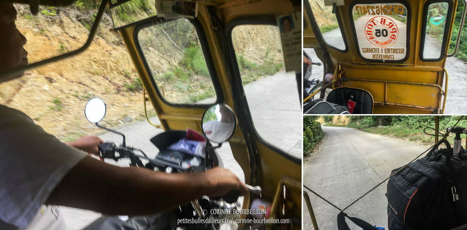 Je remercie Arnold à n’en plus finir. Sans lui, j’aurais raté Romblon. Je me serais réveillée ailleurs, en mer ou sur une autre île ! 😱 Le bon samaritain fixe mon gros sac à l’arrière de son magnifique tricycle tout jaune à la déco inspirée des taxis new-yorkais. Je lui tirerai le portrait une semaine plus tard, car j’aurai à nouveau recours à ses services pour visiter l’île (j’en parlerai dans un prochain post).