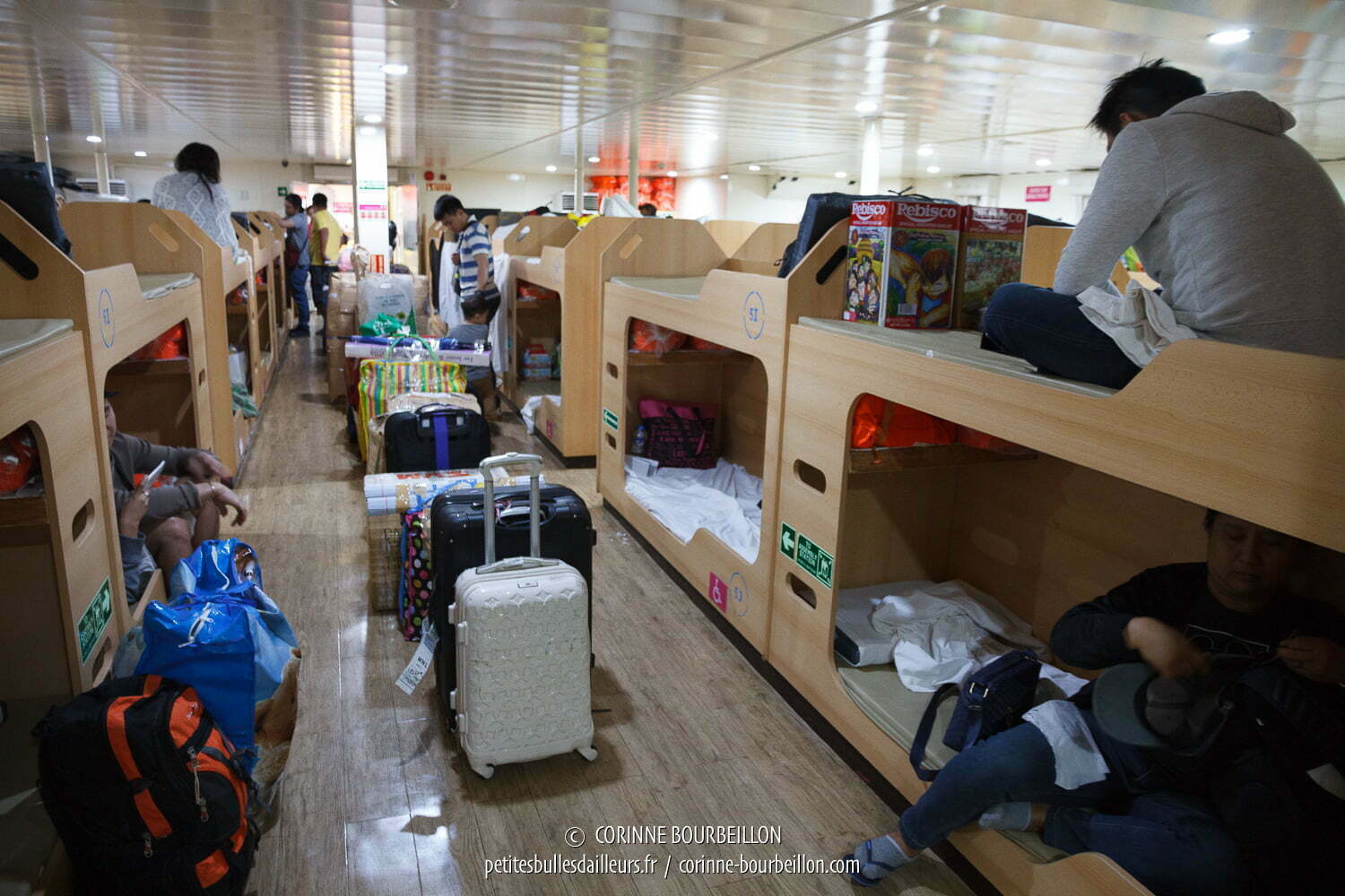 À bord, l’accueil est beaucoup plus sympathique. Des hôtesses et stewards en polos roses et bleus, courtois et souriants, renseignent les passagers. Une jeune femme me conduit à ma couchette pour la nuit. Il y a plusieurs catégories : le dortoir sans air conditionné sur le pont supérieur, le dortoir avec air conditionné en dessous, les cabines de quatre couchettes avec salle de bain et les cabines privées.