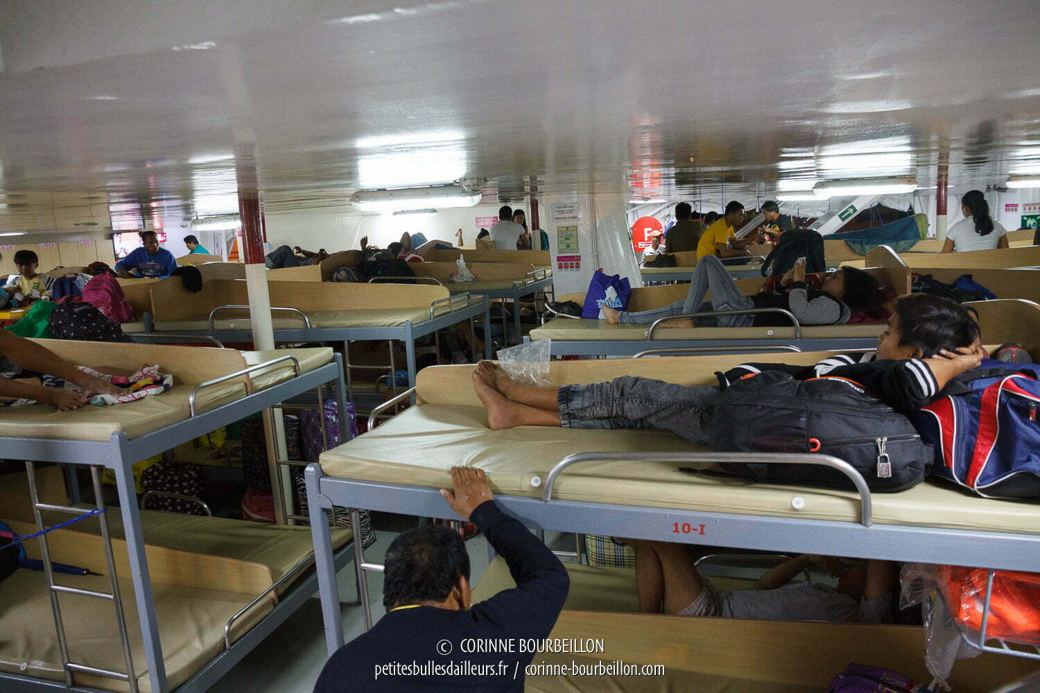 Pour les dortoirs, j’ai trouvé que ceux de ce ferry étaient vraiment bien, propres, vastes, plutôt sécurisants, ça m’a agréablement surprise. Je n’ai pas fait attention aux hublots dans le dortoir climatisé (pas sûr qu’il y en ait, en effet), en revanche le dortoir sans clim est sur le pont supérieur et donne sur l’extérieur.