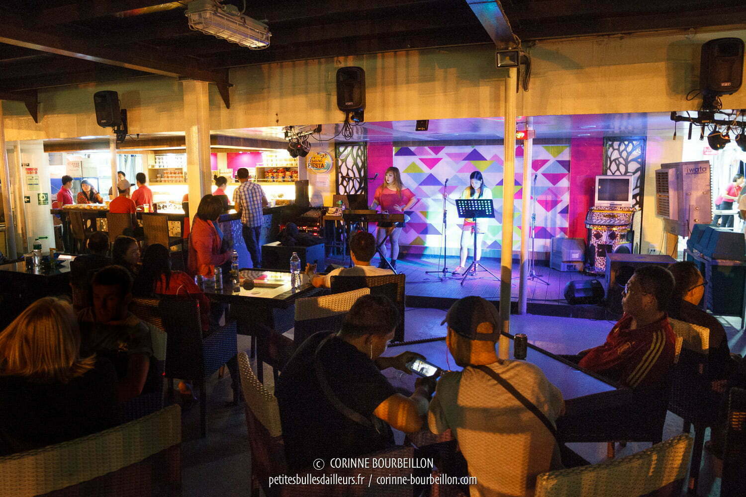 Je découvre un restaurant à proximité de ma cabine et, en haut d’un escalier, le pont du dortoir à pas cher, avec, tout au bout, la musique tonitruante, insupportable, de l’inévitable bar karaoké. Deux filles sur la minuscule scène se préparent à faire l’animation. Autour des tables, on écluse des bières. La croisière s’amuse, version philippine… 😁