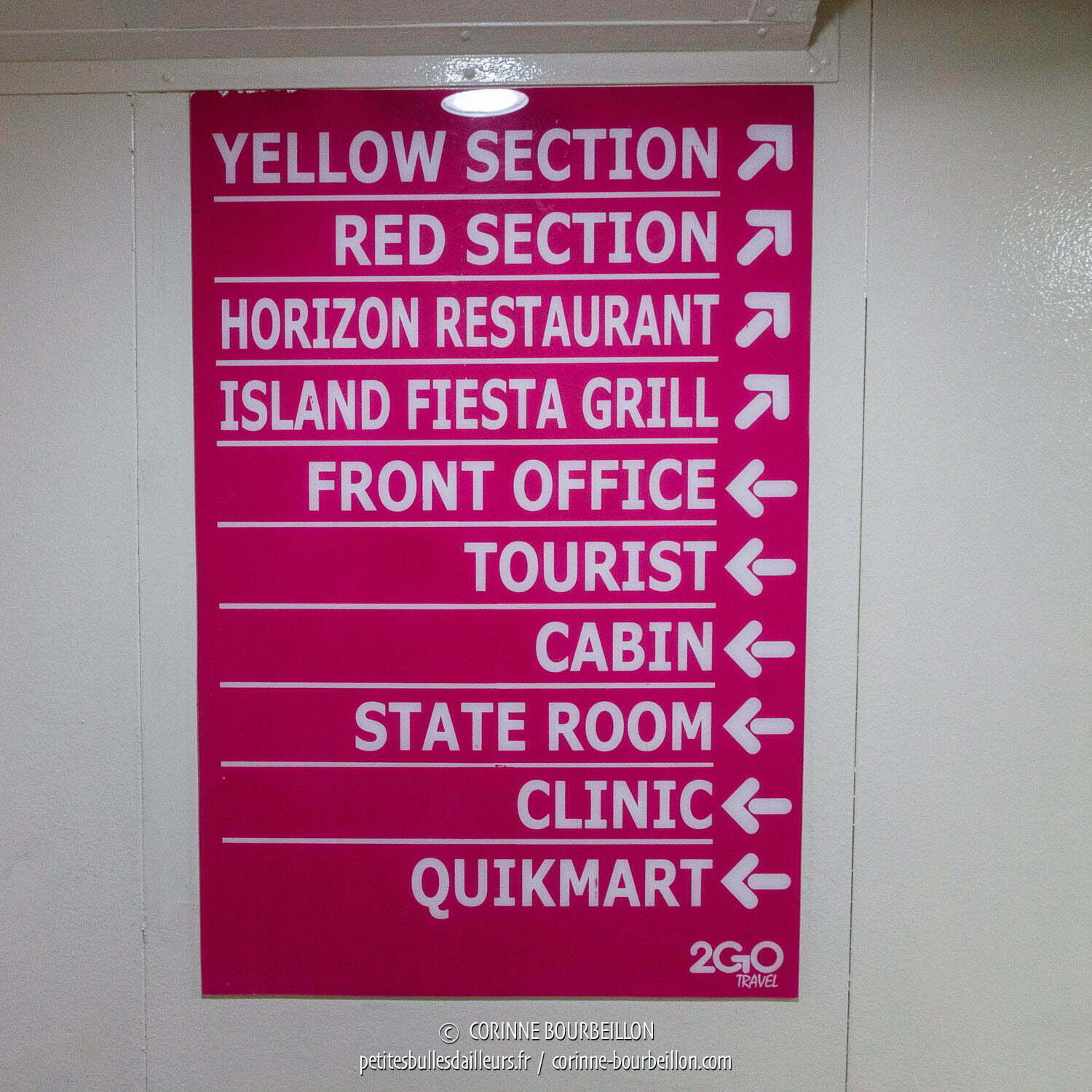 Je suis dans une stateroom de quatre. Et j’ai un peu peur en entrant : il fait super froid avec la clim en mode frigo, la télé est à fond et parmi mes compagnons de chambrée, outre deux messieurs potentiels ronfleurs, il y a une dame d’âge mûr avec un tout petit enfant, apparemment pas calme du tout… 😱 J’échange des sourires polis avec les uns et les autres, prends possession de ma couchette située en bas et ressors explorer rapidement le navire avant le départ.